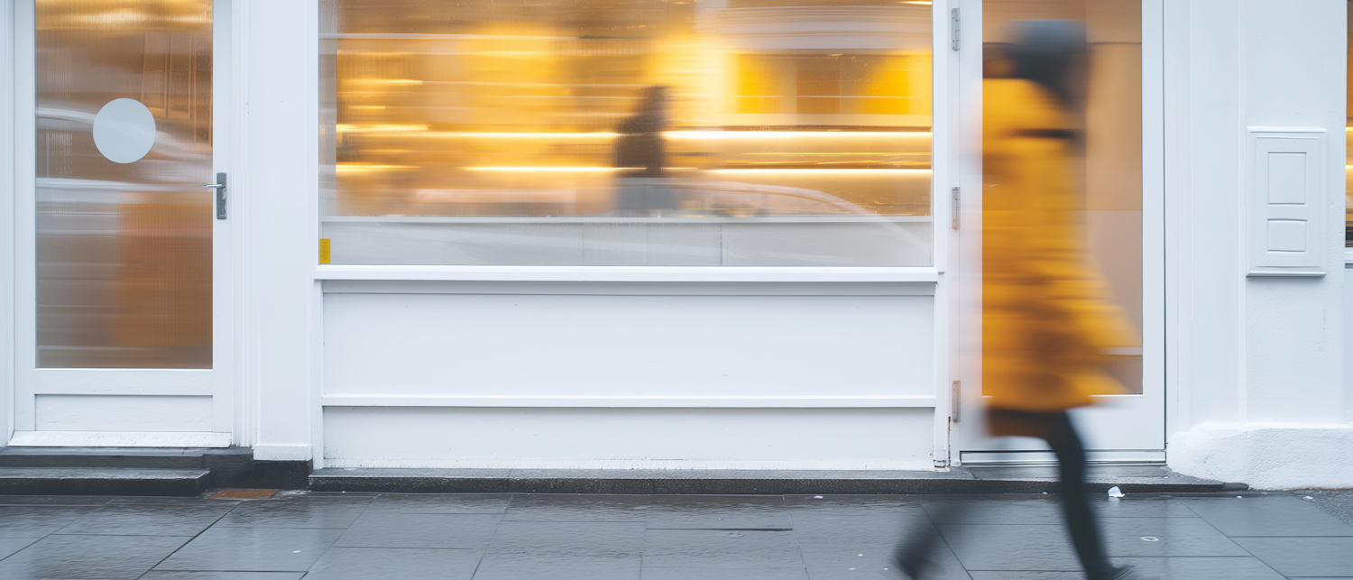 Blurred figure in yellow coat walks past a modern storefront with warm lighting, creating a dynamic and cozy urban scene.