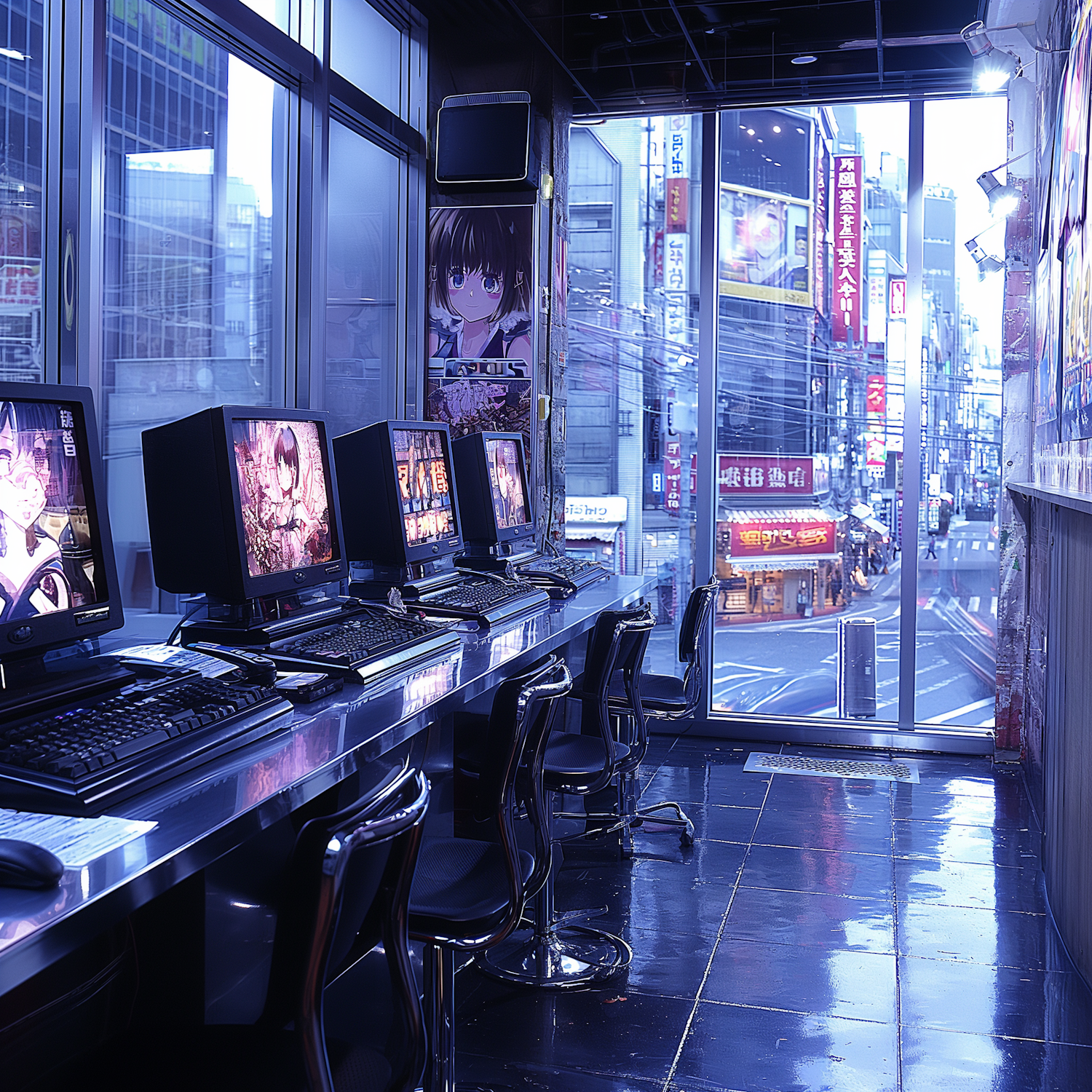 Modern internet cafe with anime-themed decor, sleek computers, and a view of a bustling city street with neon signs.
