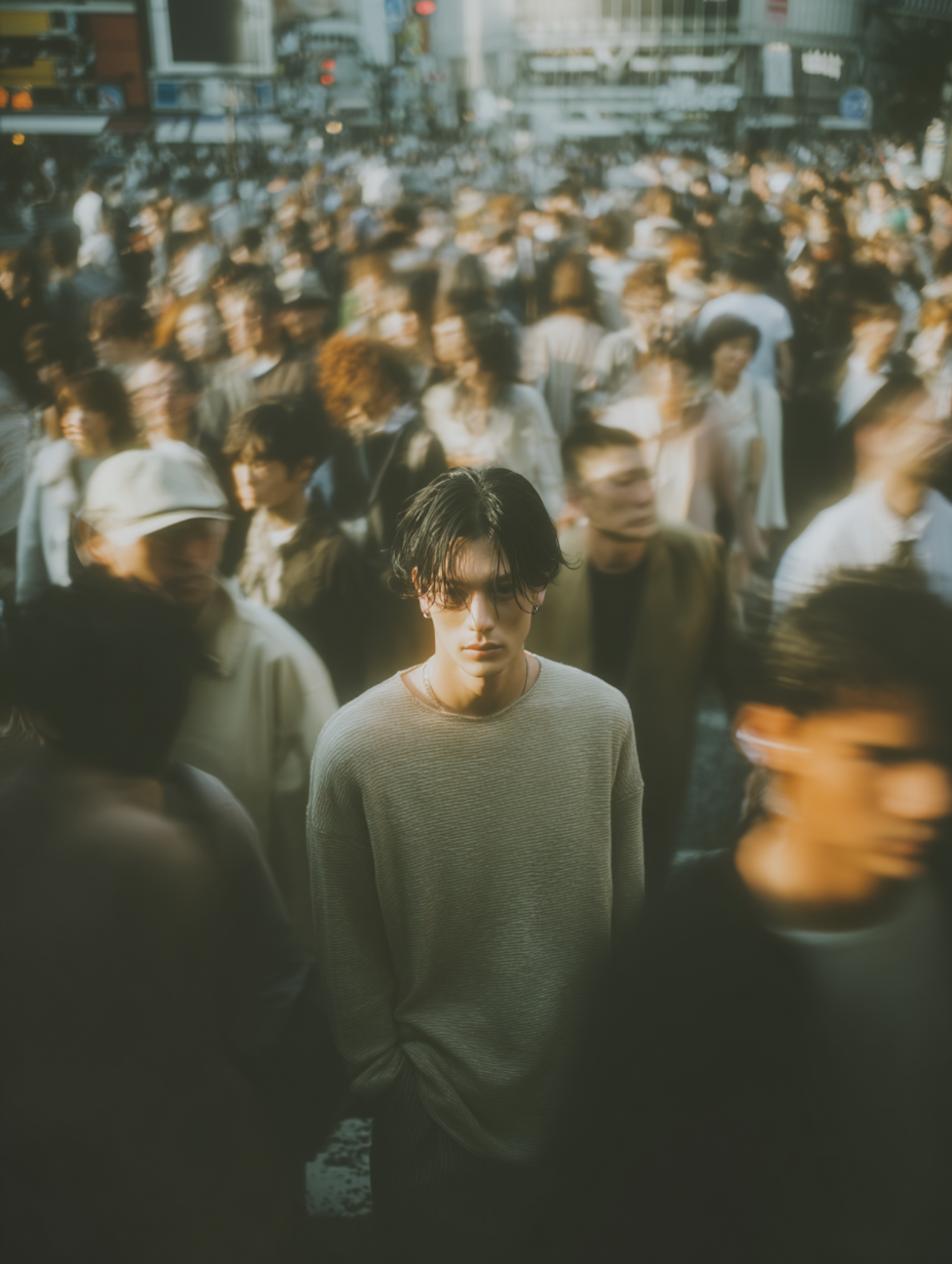 A young man in a light sweater stands still in a bustling urban crowd, creating a striking contrast with the blurred motion around him.
