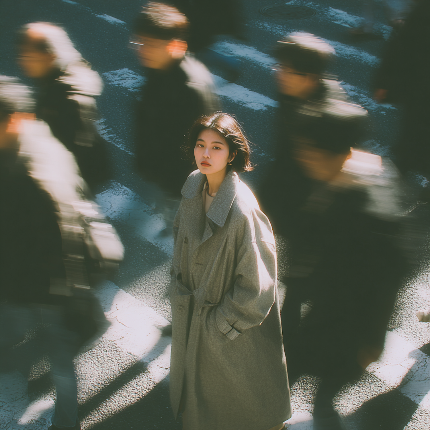 A young woman in a gray trench coat stands still amidst a blurred crowd, creating a striking contrast of calm and motion.