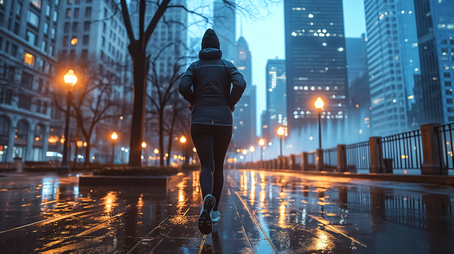 Jogger in dark attire runs on a wet city street, illuminated by street lamps, amidst tall buildings and bare trees.