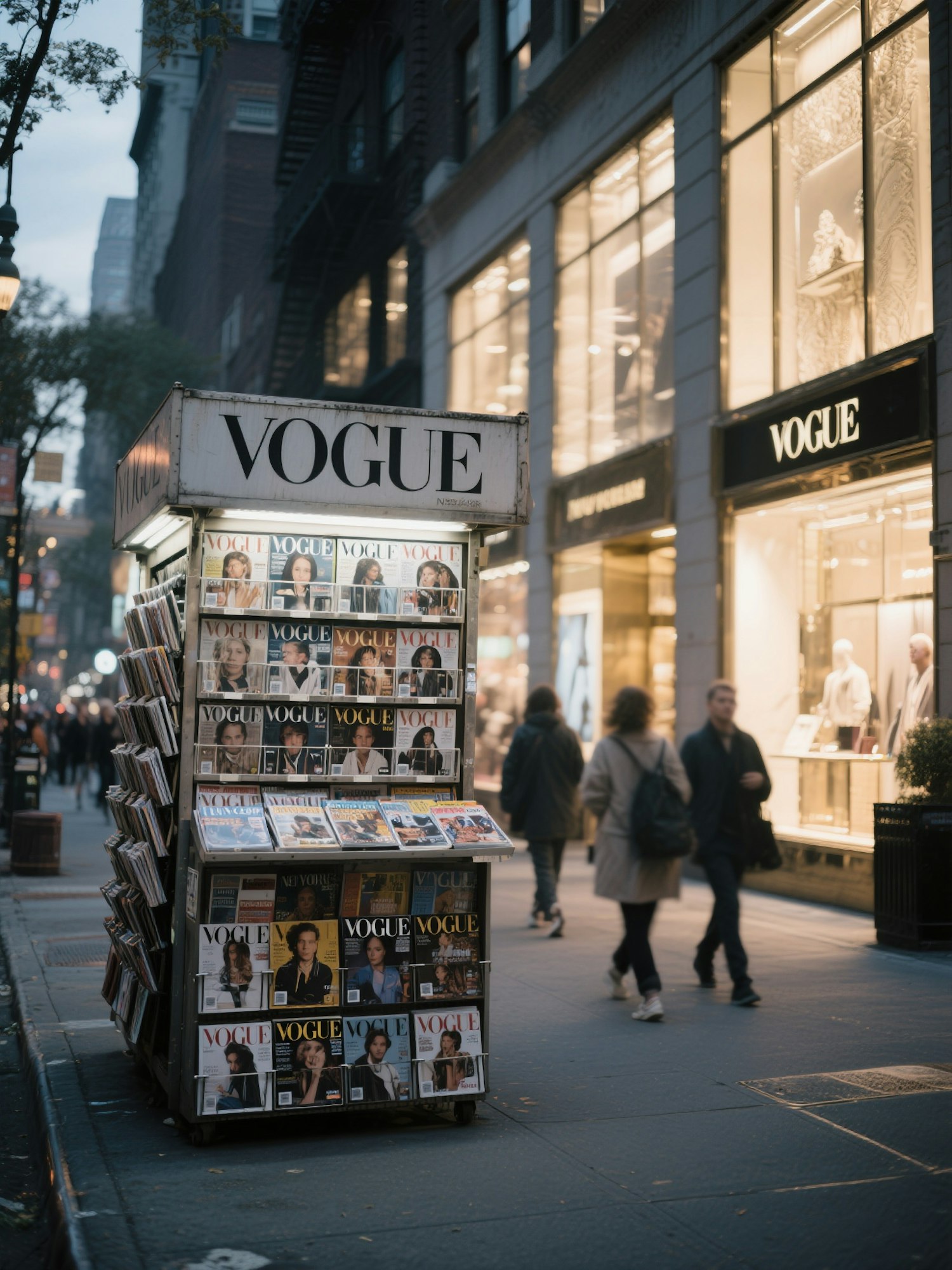 A stylish magazine stand on a city street, showcasing Vogue issues, with a Vogue store in the background and pedestrians passing by.