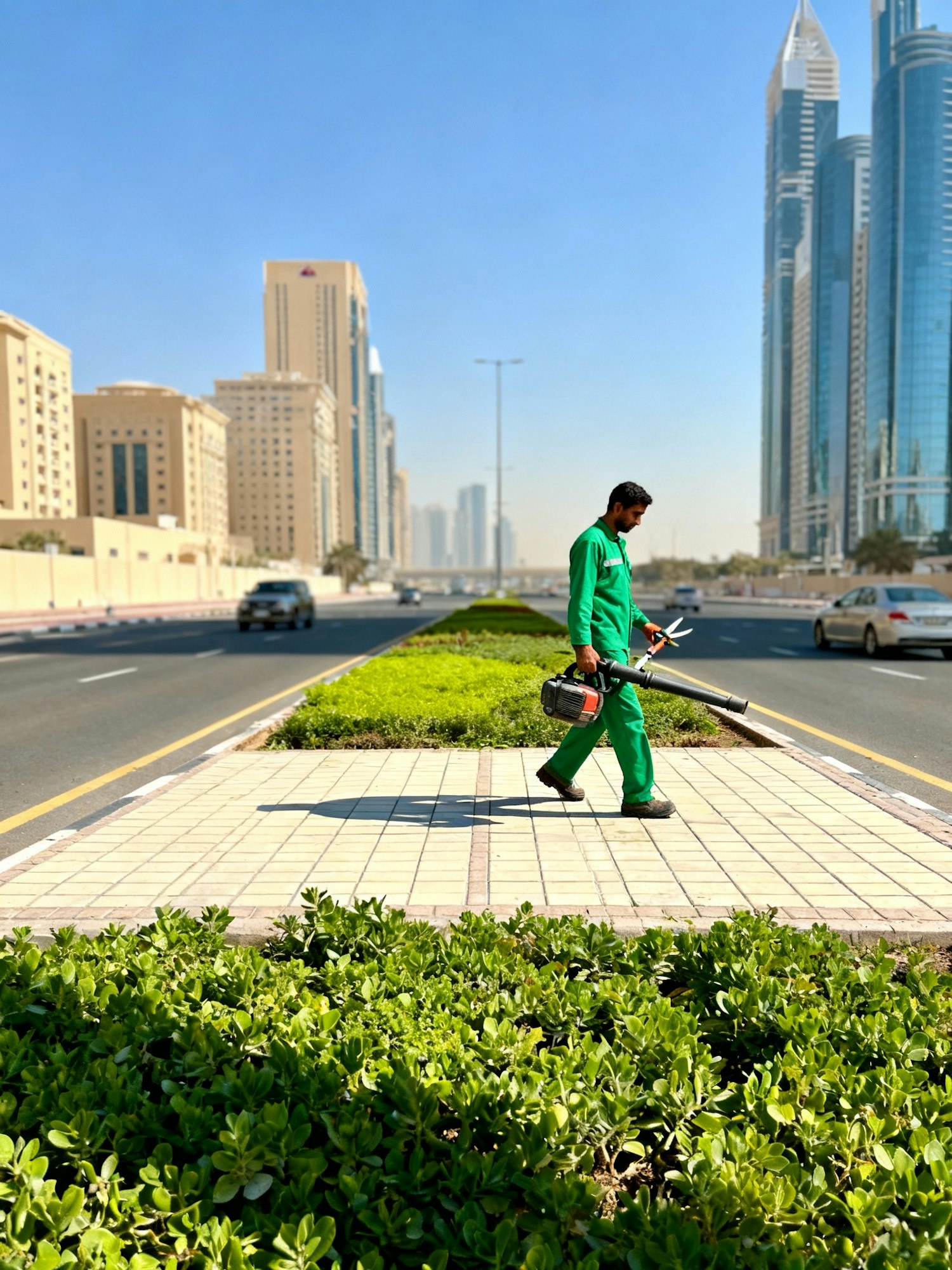 Late-morning near a landscaped median on a Dubai road, clear sky, mixed beige and glass towers behind; landscaping worker in green uniform walking across paved service path carrying pruning shears/leaf blower, background vehicles softly blurred; sun catching light tiles and green plants. 35 mm, 1/800 s, f/4, ISO 100, WB 5200 K; front-lit with soft bounce from nearby wall to keep uniform detail. Negative: company logos, overpolarized sky, HDR look.