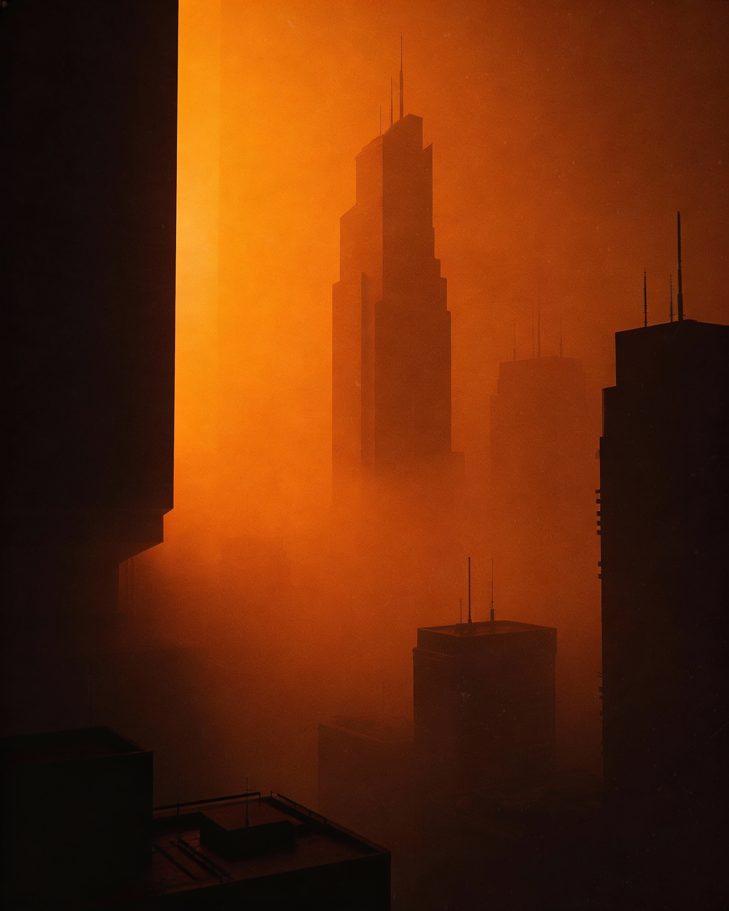 A dramatic cityscape with skyscrapers silhouetted against a vibrant orange sky, partially obscured by fog, creating a mysterious atmosphere.