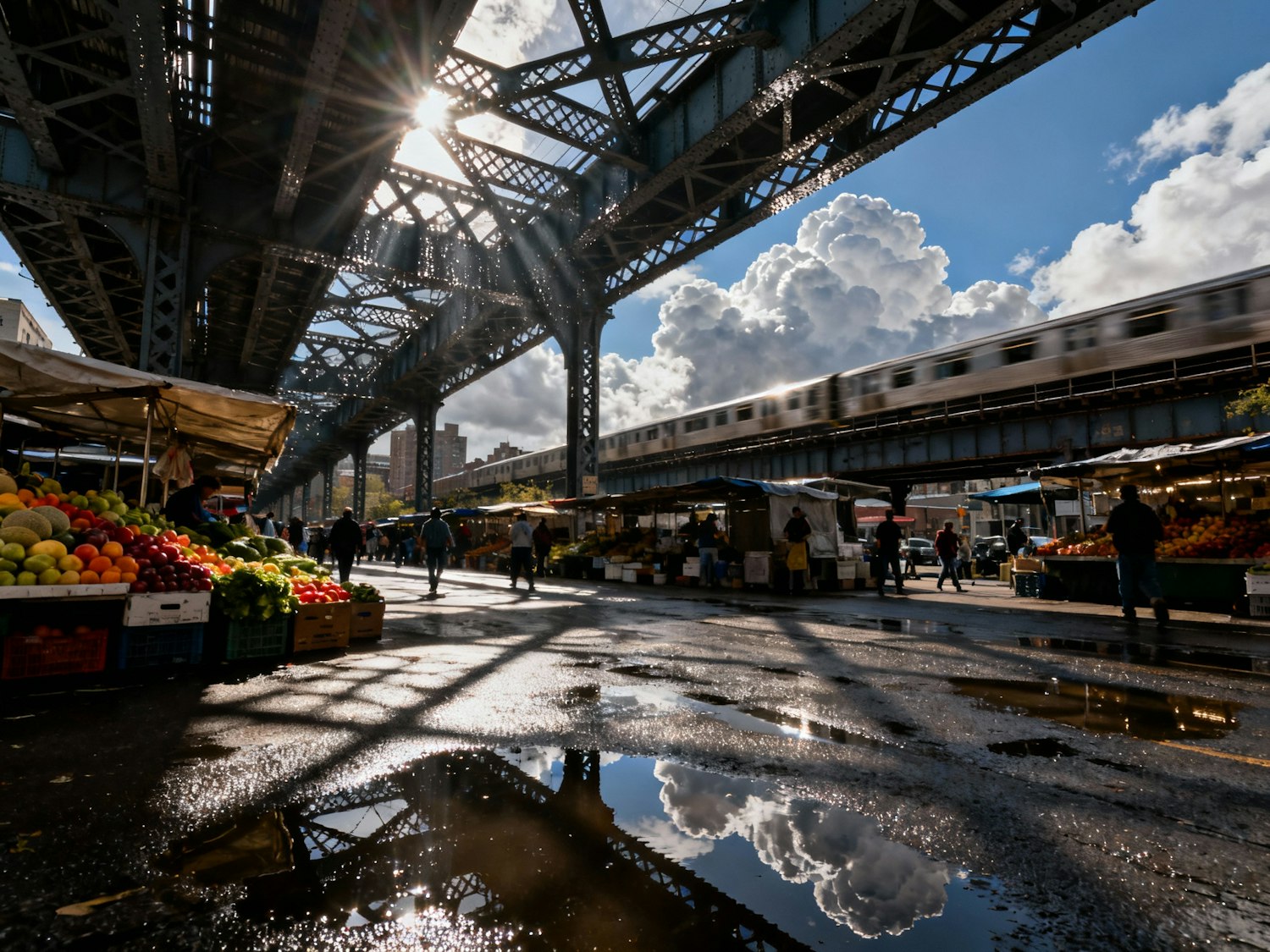 Urban street market beneath an elevated rail; steel lattice dripping, clouds towering beyond; sun break threads through girders, raking produce stalls and rain slicks; distant train blur; 24 mm, f/7.1, ISO 100, 1/250 s; circular polarizer to darken sky and manage metal reflections—keep rotation subtle to prevent banding. Negative: gray haze left uncorrected, over-clarity, halo edges, moiré on grids.