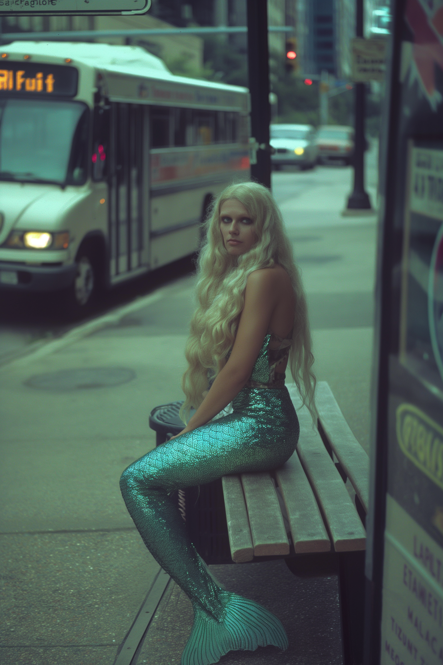 A woman in a shimmering mermaid costume sits on a city bench, blending fantasy with urban life.