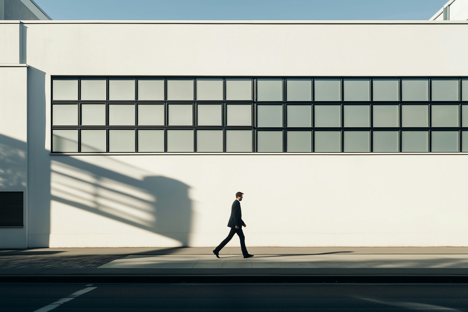 A man in a suit walks past a modern white building with grid windows, casting long shadows in bright sunlight. Minimalist urban vibe.
