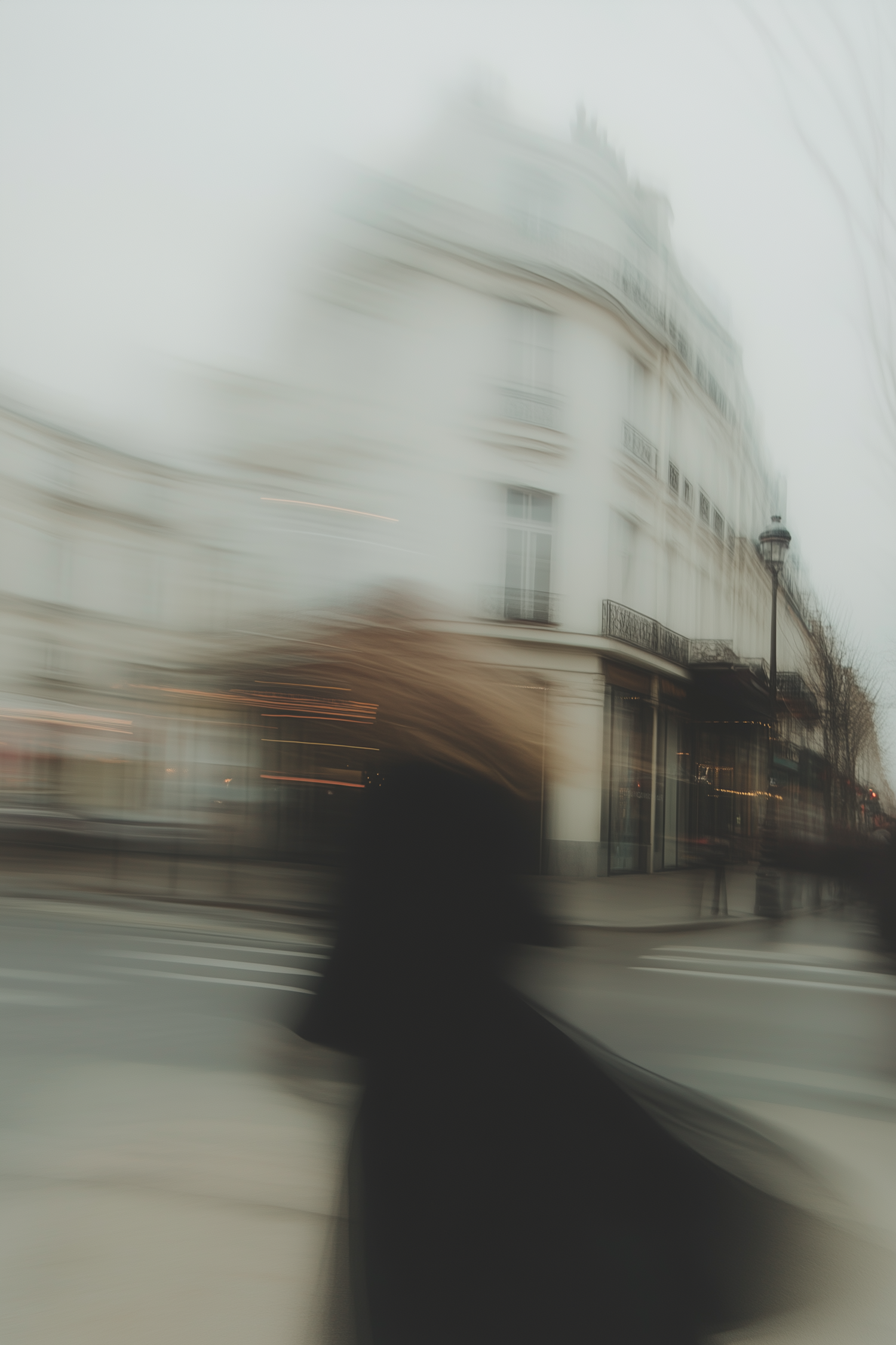 Blurred motion of a person walking past a European-style building on a foggy day, evoking a dreamy urban atmosphere.