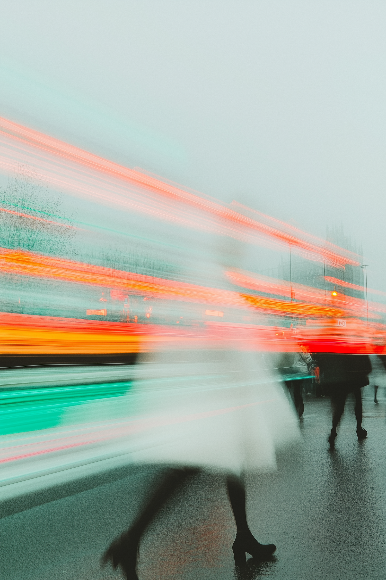 Blurred figure walking in a foggy city with vibrant streaks of red, orange, and green lights, creating a dynamic and mysterious urban vibe.