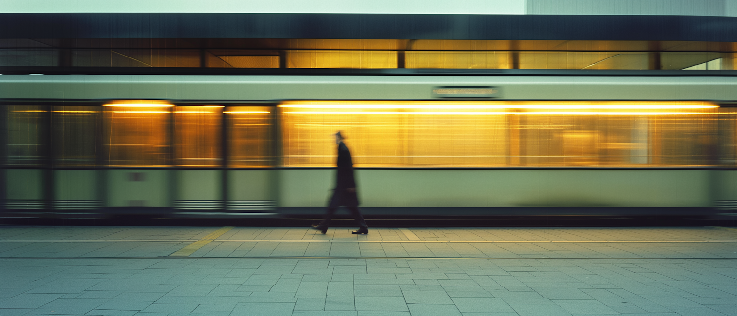 Blurred silhouette of a person walking in front of a moving tram with warm yellow lights, creating a dynamic urban scene.