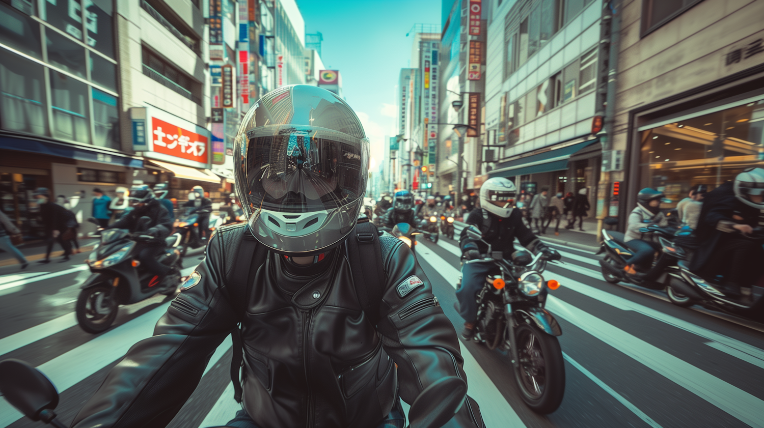 Motorcyclists ride through a bustling city street, surrounded by tall buildings and vibrant signs, creating a dynamic urban scene.