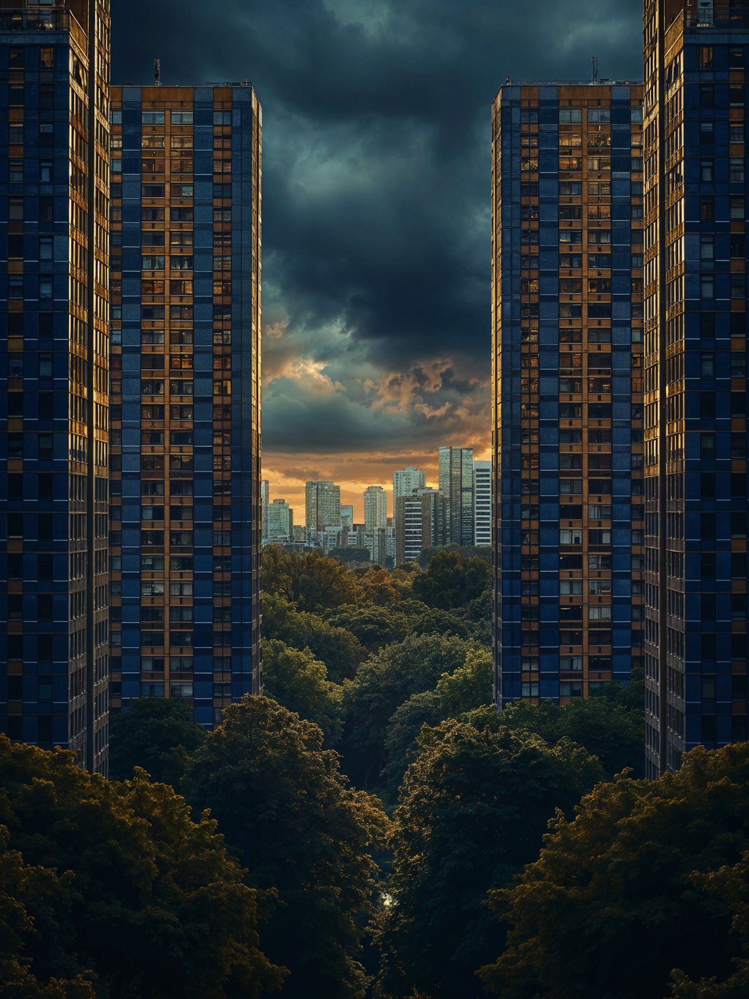 Dramatic cityscape with towering skyscrapers, lush greenery, and a moody sunset sky, creating a striking urban-nature contrast.