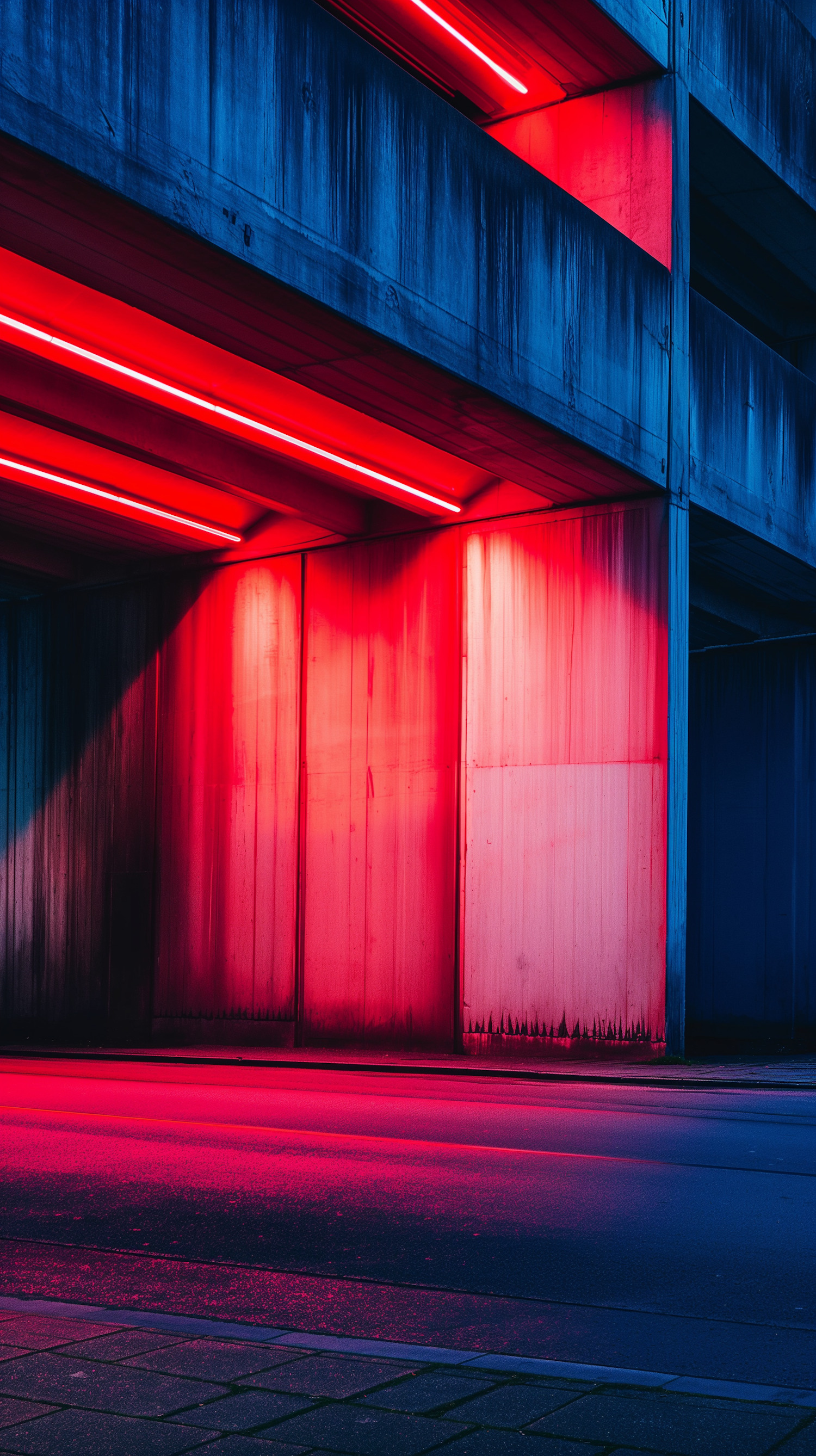 Vibrant urban scene with red and blue neon lights illuminating a concrete structure, creating a modern and futuristic atmosphere.