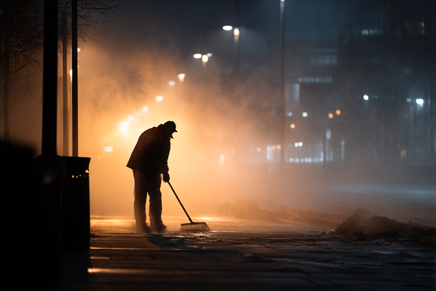 A person sweeps a misty sidewalk at night, illuminated by warm streetlights, creating a serene and atmospheric urban scene.