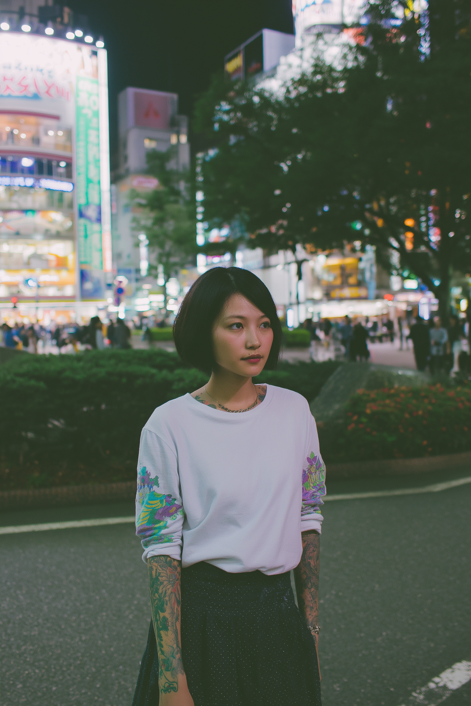 Chic urban night portrait of a woman with stylish tattoos and vibrant lights setting the scene.