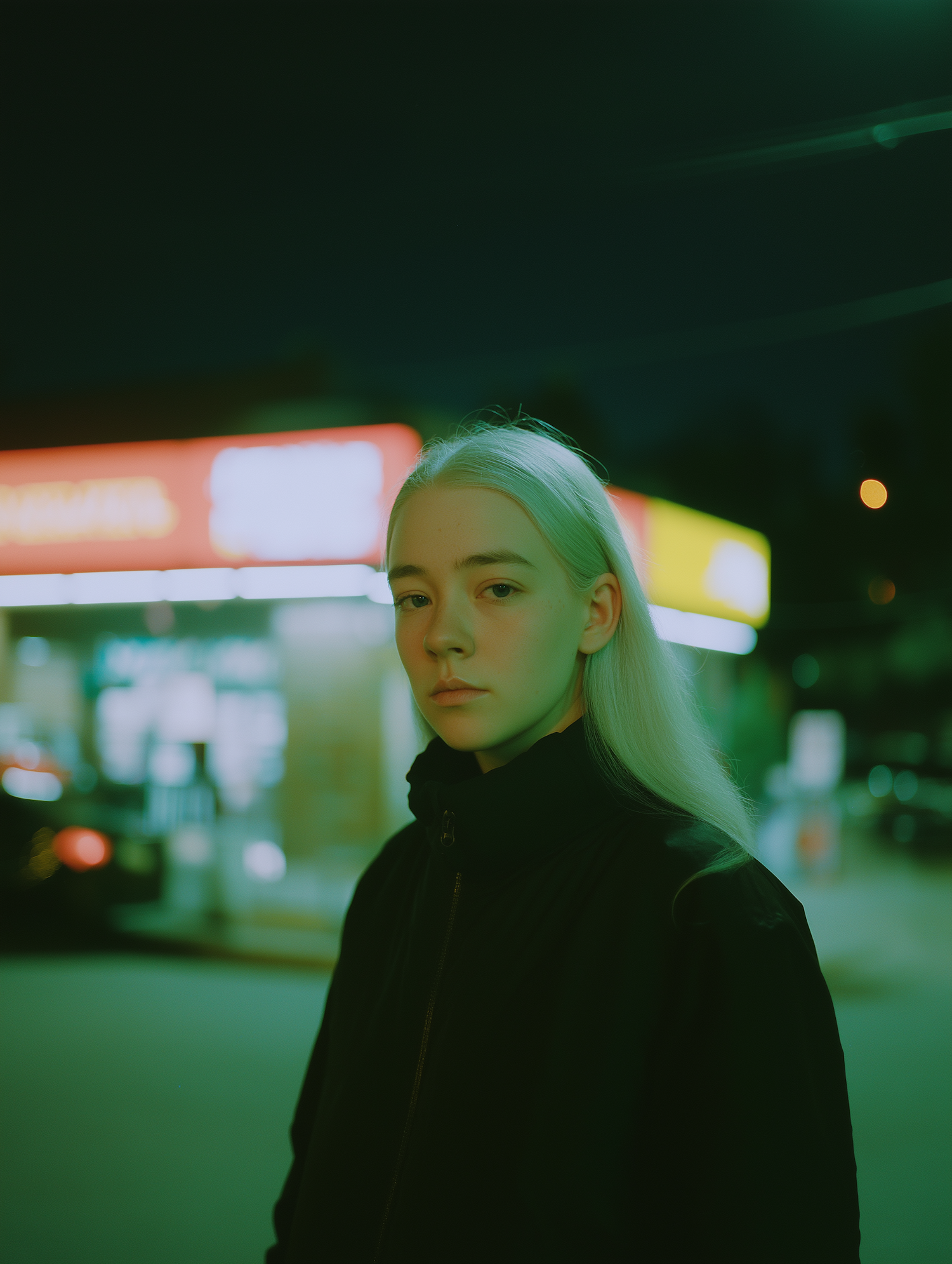 A person with light hair and a dark jacket stands in a moody, green-lit urban night scene with blurred storefronts and streetlights.