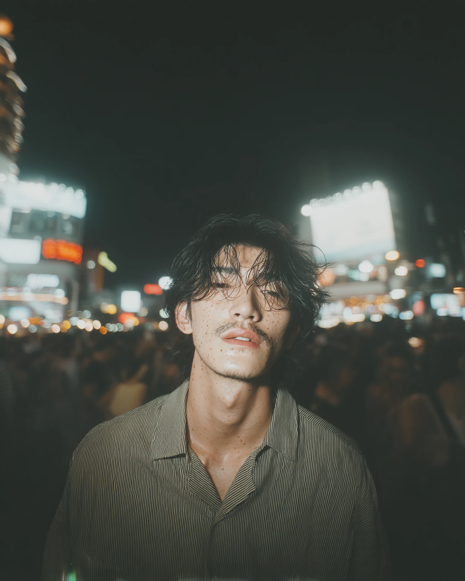 A young man in a striped shirt stands in a vibrant city at night, with blurred lights and a bustling crowd in the background.