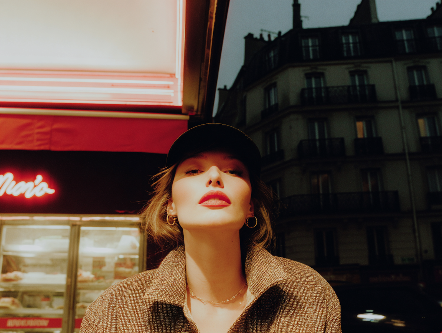 Stylish individual in a city at night, illuminated by neon lights, wearing a cap and textured coat, with an urban building backdrop.