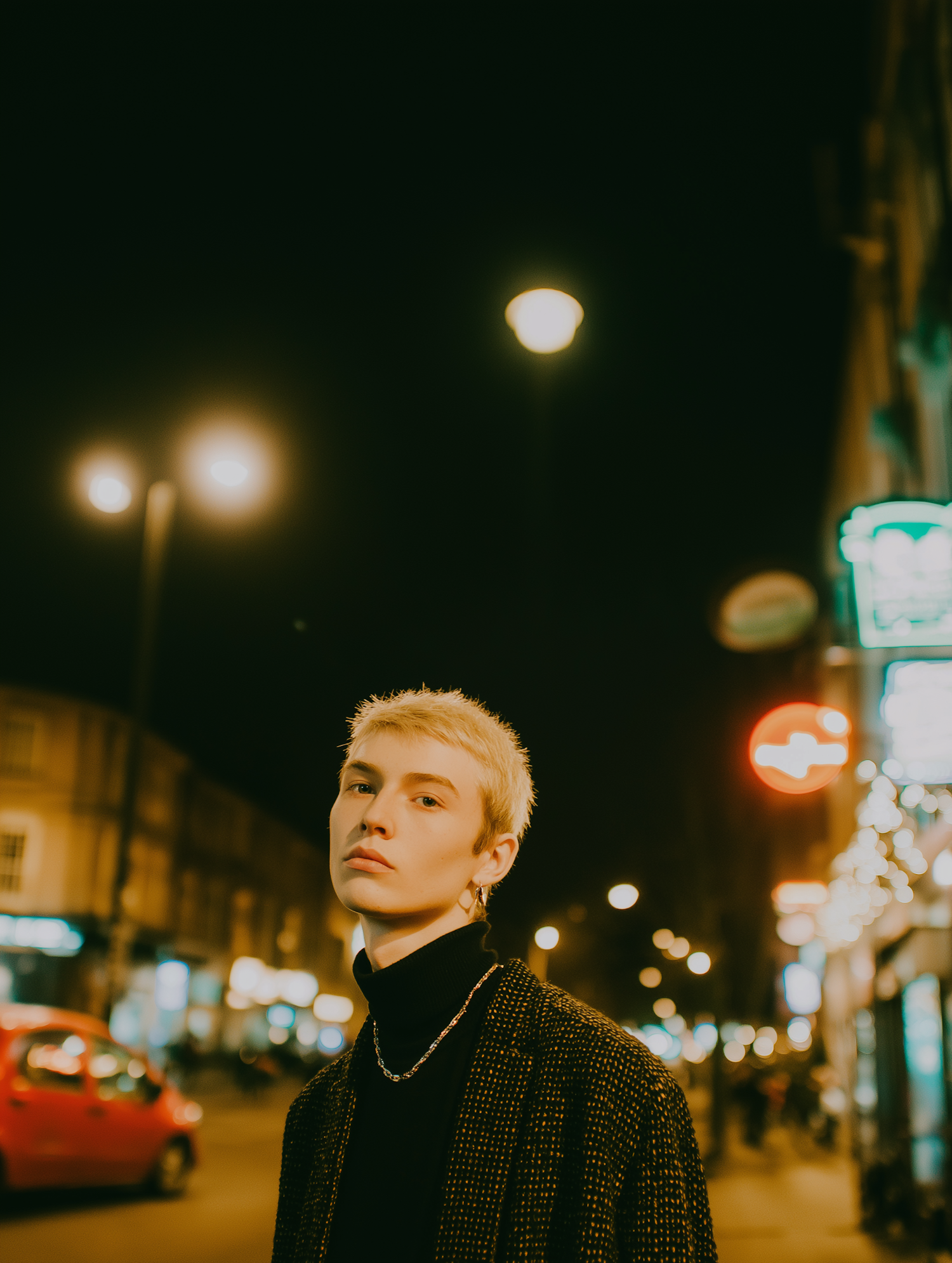Stylish individual in a city at night, wearing a textured jacket and silver accessories, with vibrant streetlights in the background.