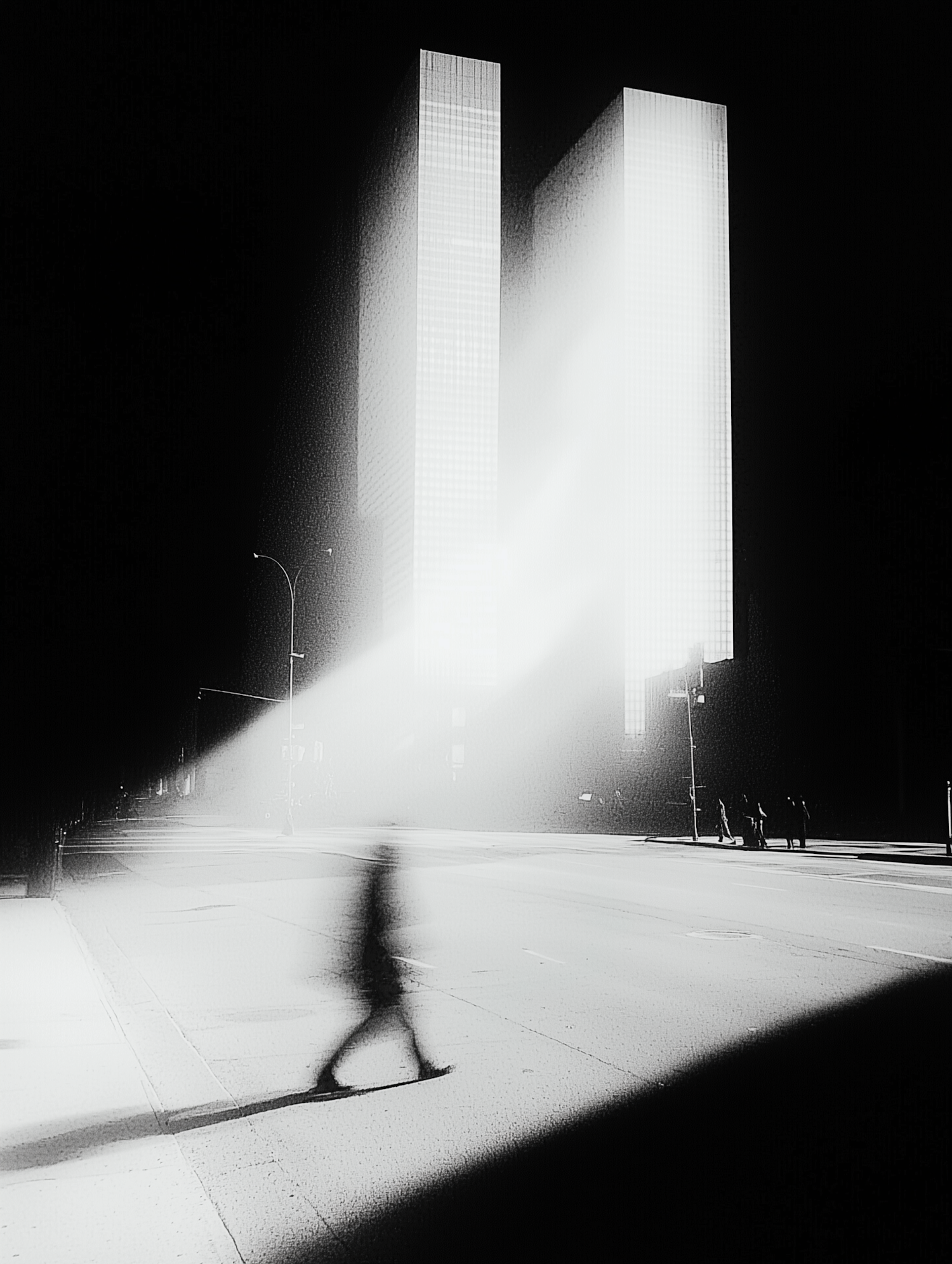 Monochrome cityscape with illuminated skyscrapers and a blurred pedestrian, creating a dramatic and surreal nighttime scene.