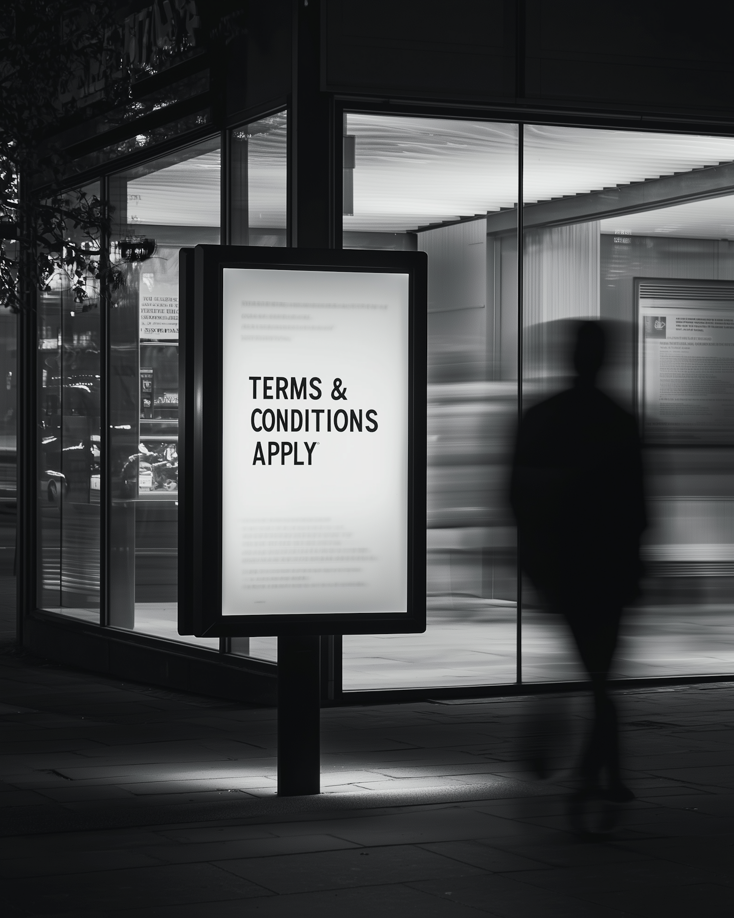 A glowing sign reading 'TERMS & CONDITIONS APPLY' stands on a city sidewalk at night, with a blurred figure walking past in the background.