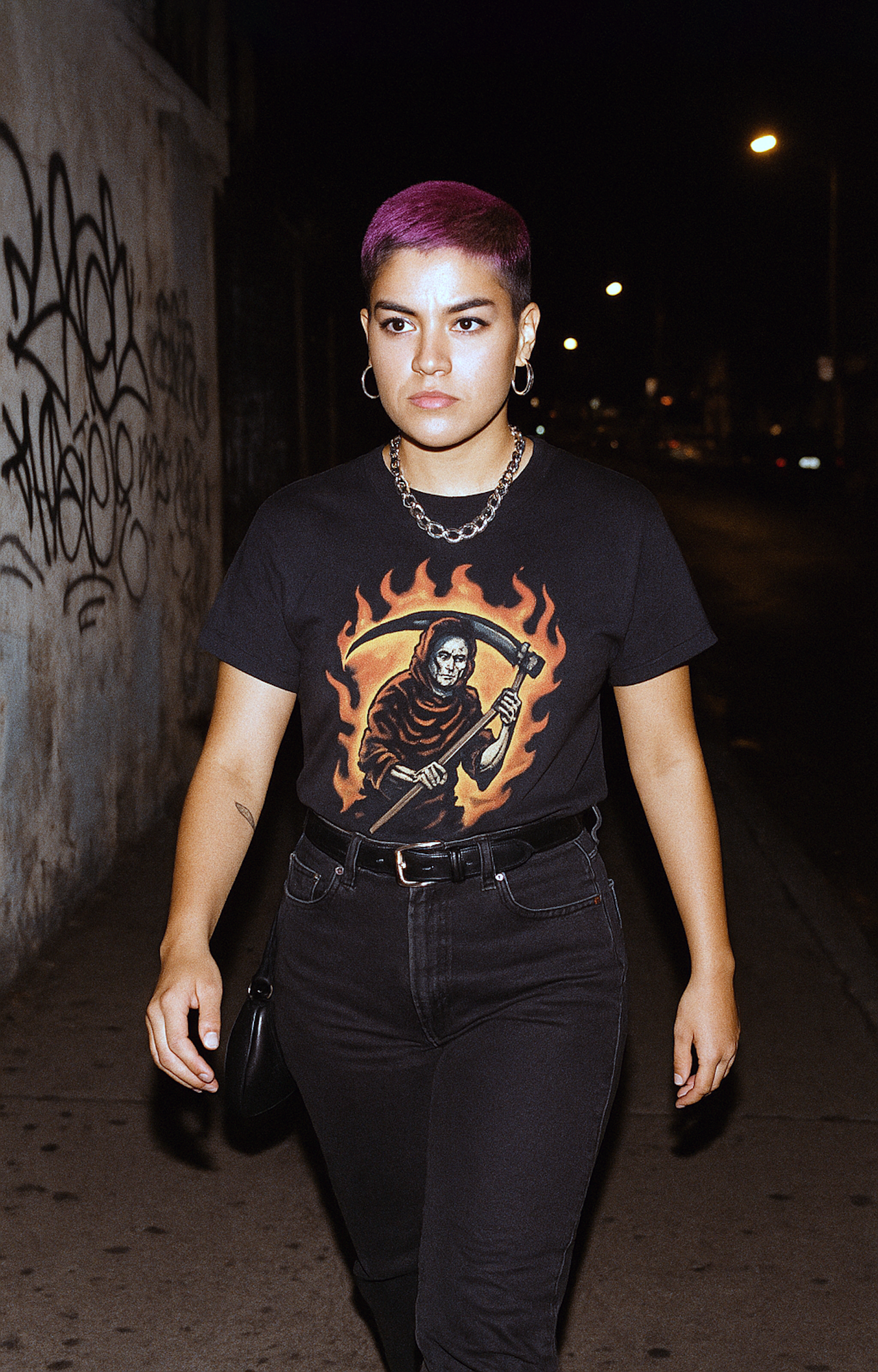 A woman with purple hair and a bold graphic tee walks confidently on a graffiti-lined street at night, exuding urban style.
