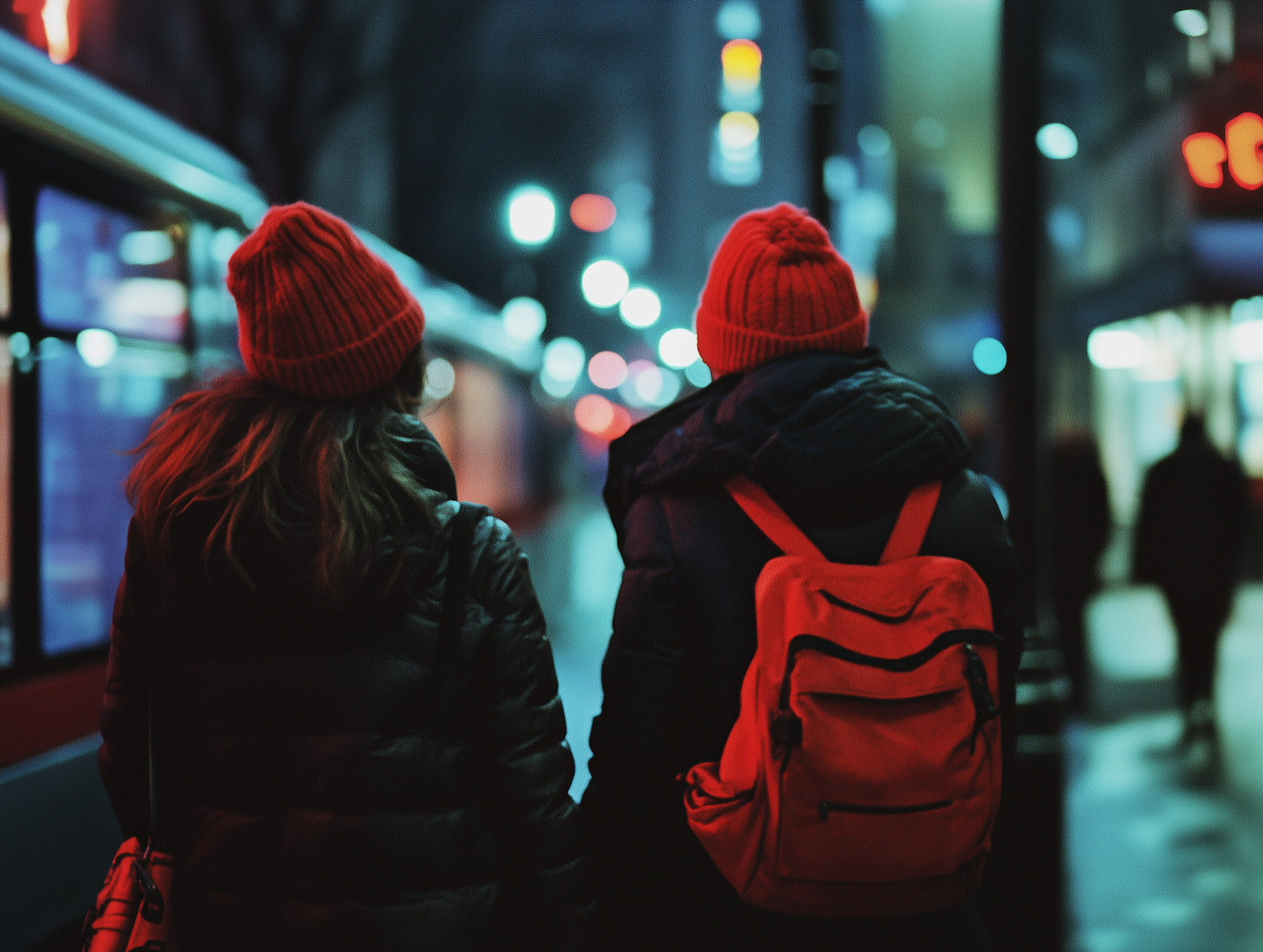 Two people in red beanies walk through a neon-lit city street at night, one with a red backpack, creating a warm, urban scene.