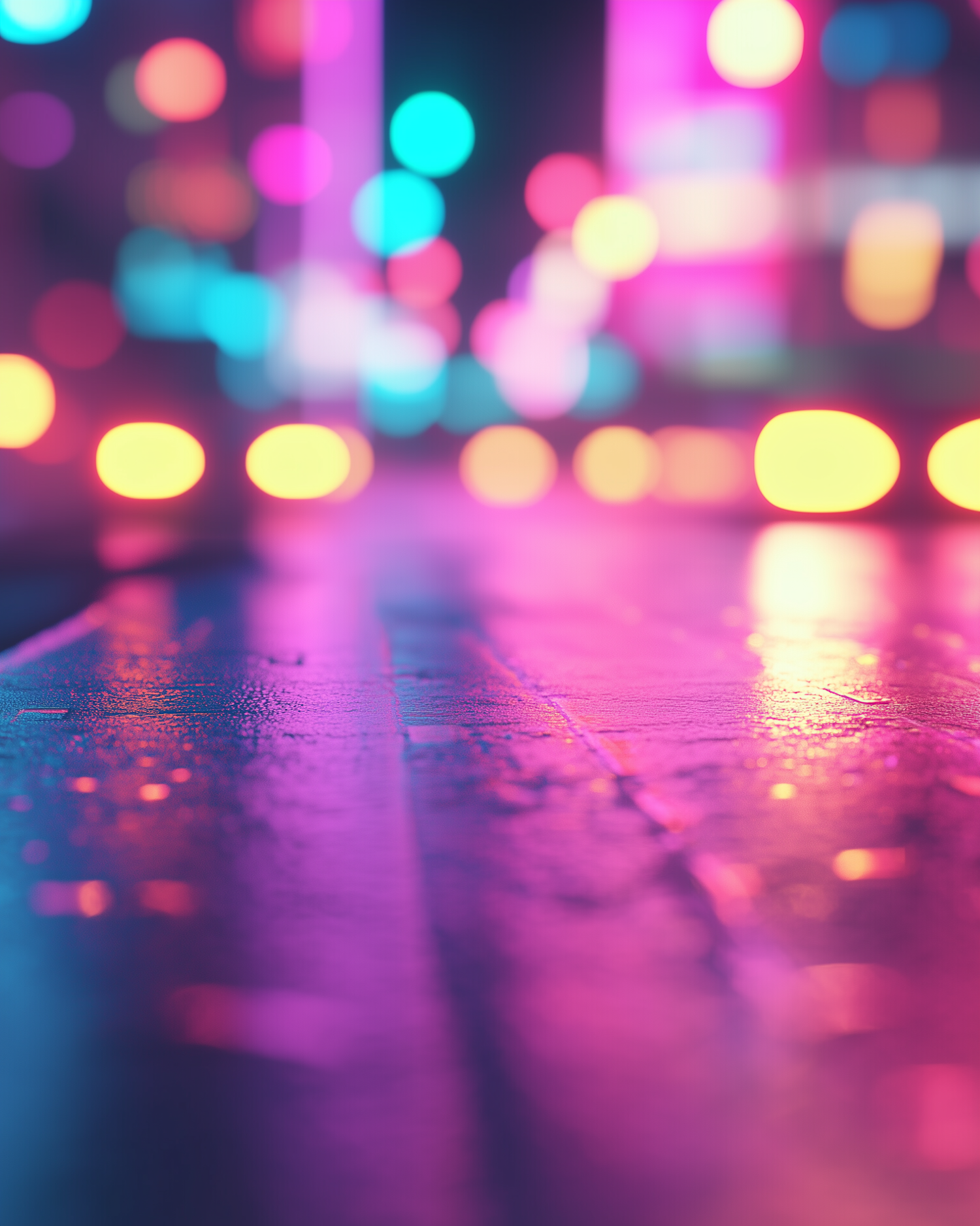 Vibrant neon bokeh lights reflecting on a wet surface, creating a colorful urban night scene.
