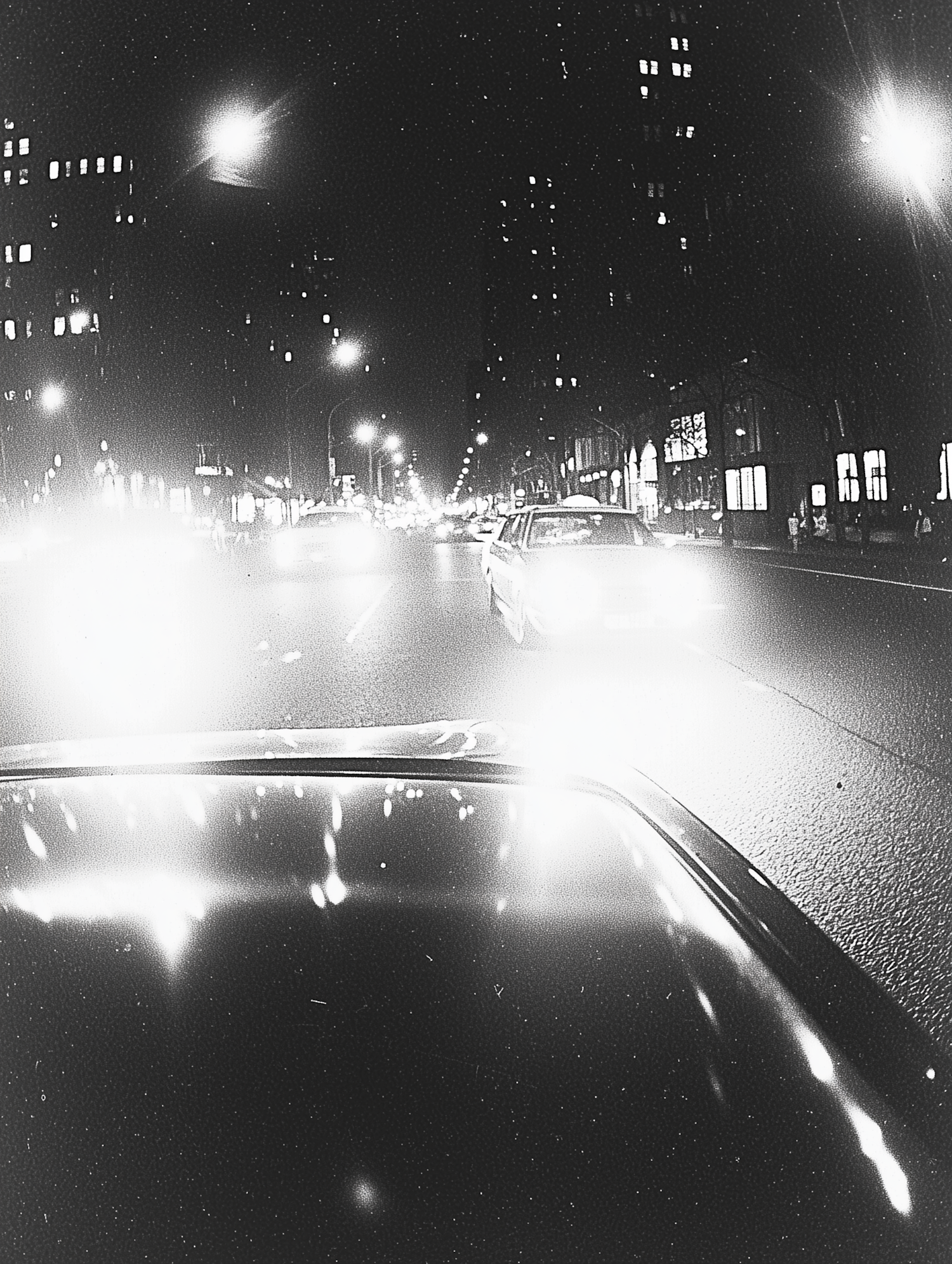 Black and white city street at night with bright car headlights and glowing building windows, creating a dynamic urban scene.