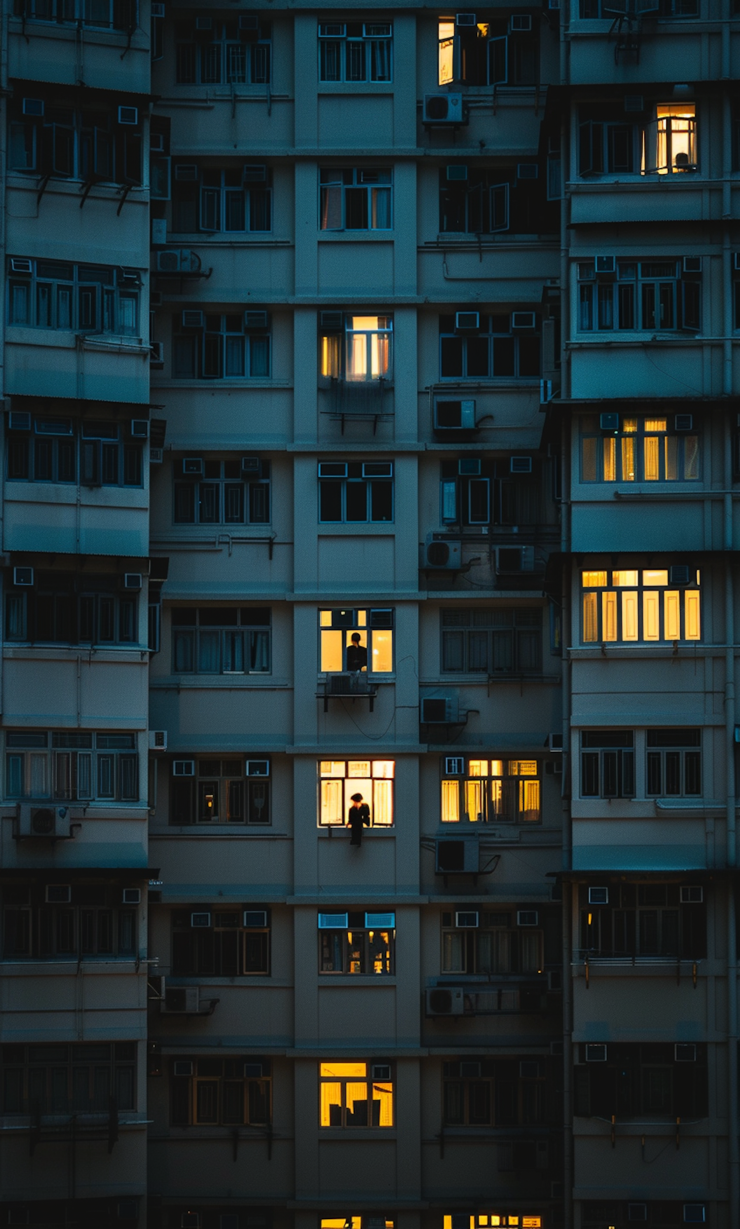 High-rise building with lit windows at night, featuring a silhouette in one window, creating a striking urban scene.