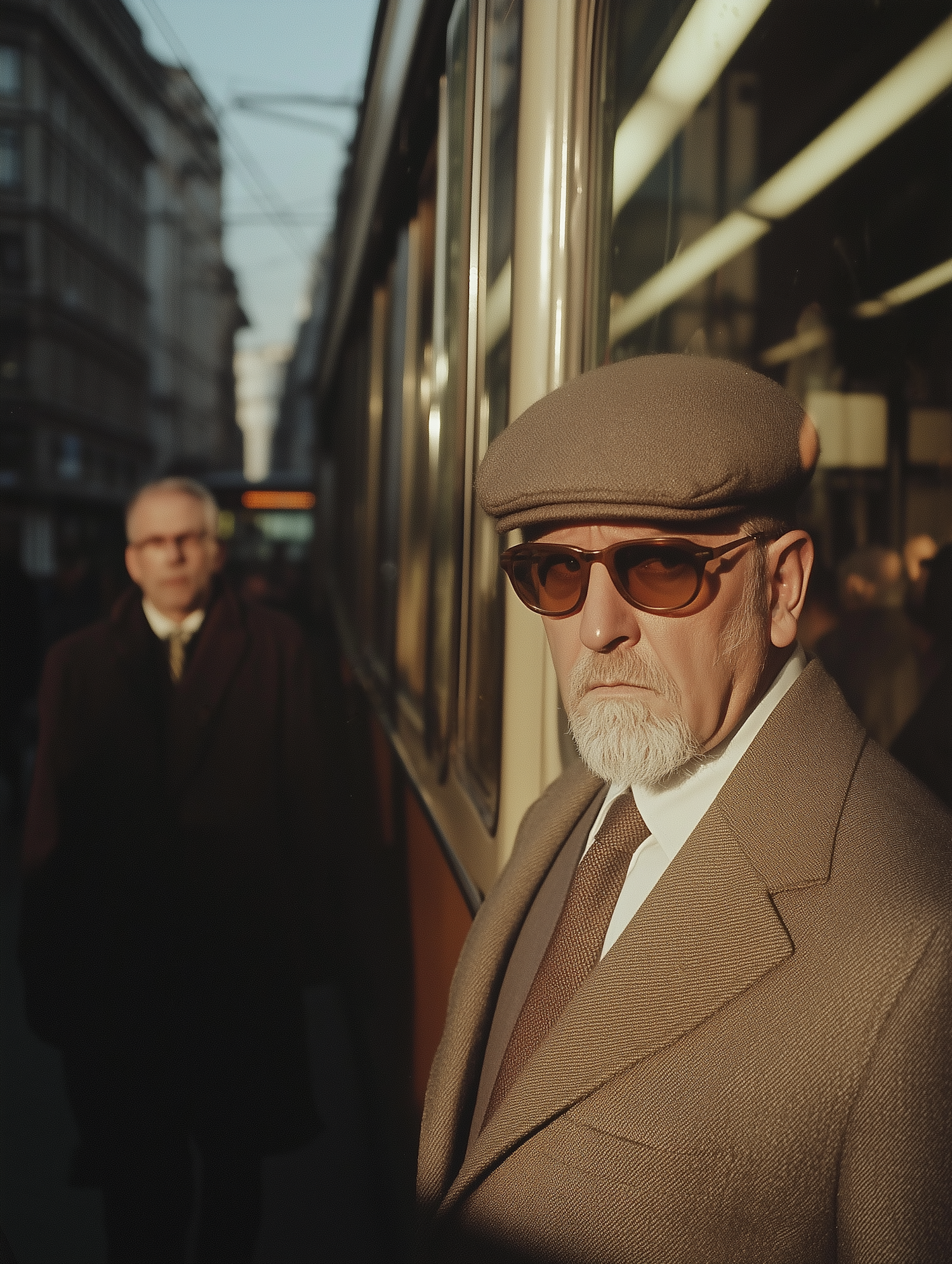Stylish older man in a beige suit and flat cap near a tram, with warm lighting and a nostalgic urban vibe.