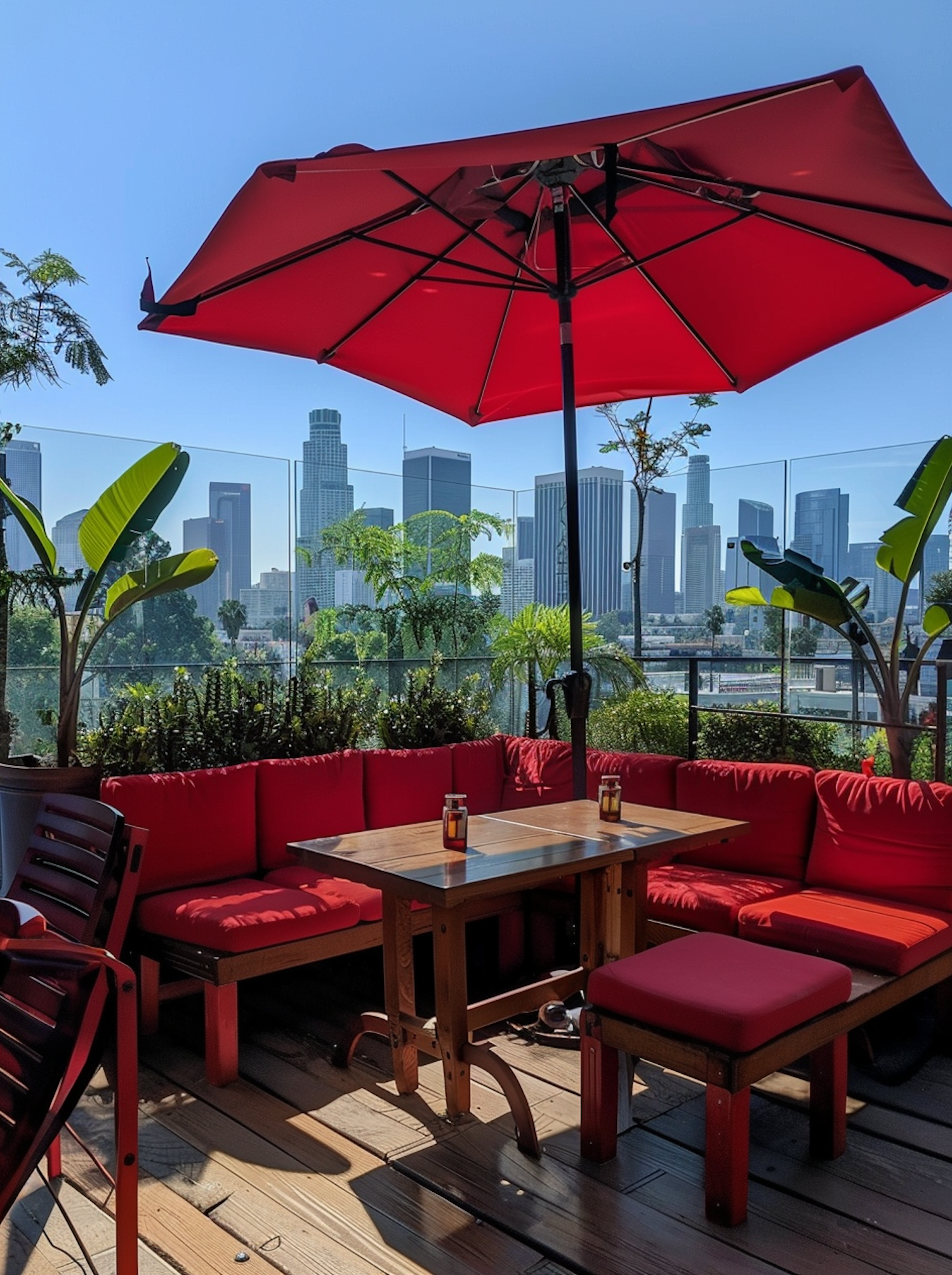Rooftop patio with red umbrella, city skyline view, and lush greenery. Cozy seating with red cushions and wooden table under clear blue sky.