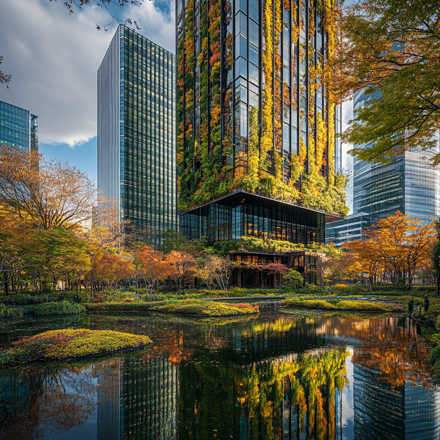 Modern skyscraper with vertical greenery surrounded by autumnal trees and a reflective pond, blending architecture with nature.