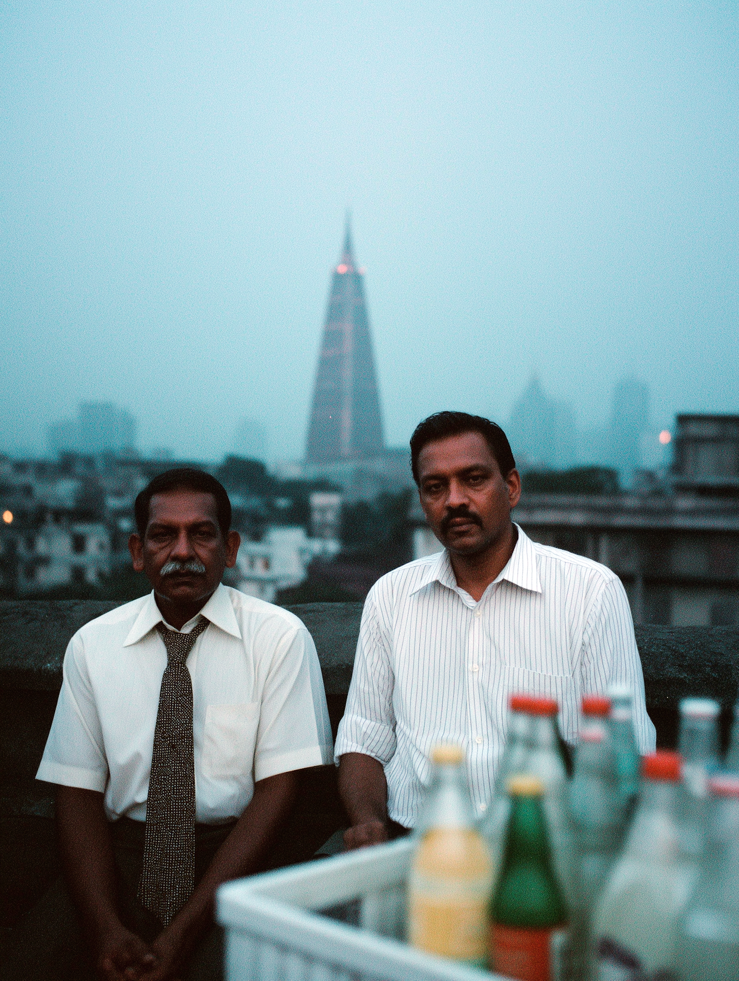 Two men sit outdoors with a city skyline in the background, featuring a triangular skyscraper and bottles of beverages in the foreground.