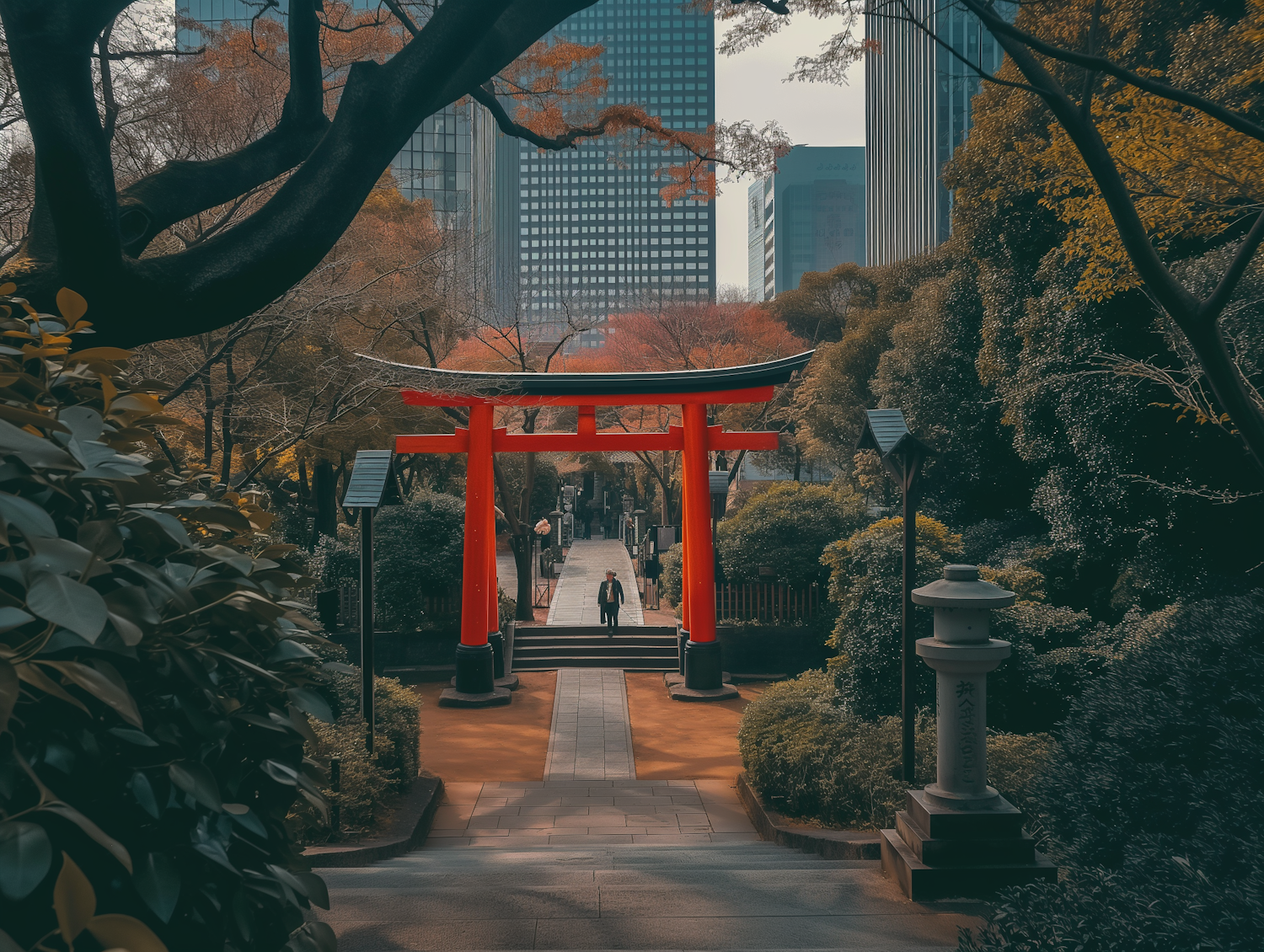A red torii gate in a tranquil garden path, surrounded by lush greenery and modern skyscrapers in the background.