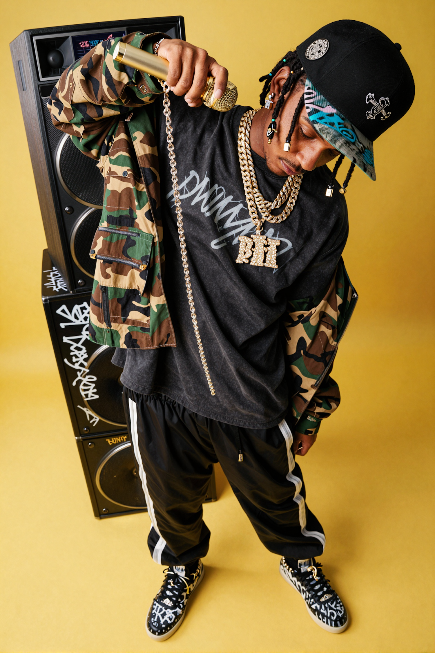 A stylish individual in urban attire poses with a golden microphone against a yellow background, with a graffiti-decorated speaker behind them.