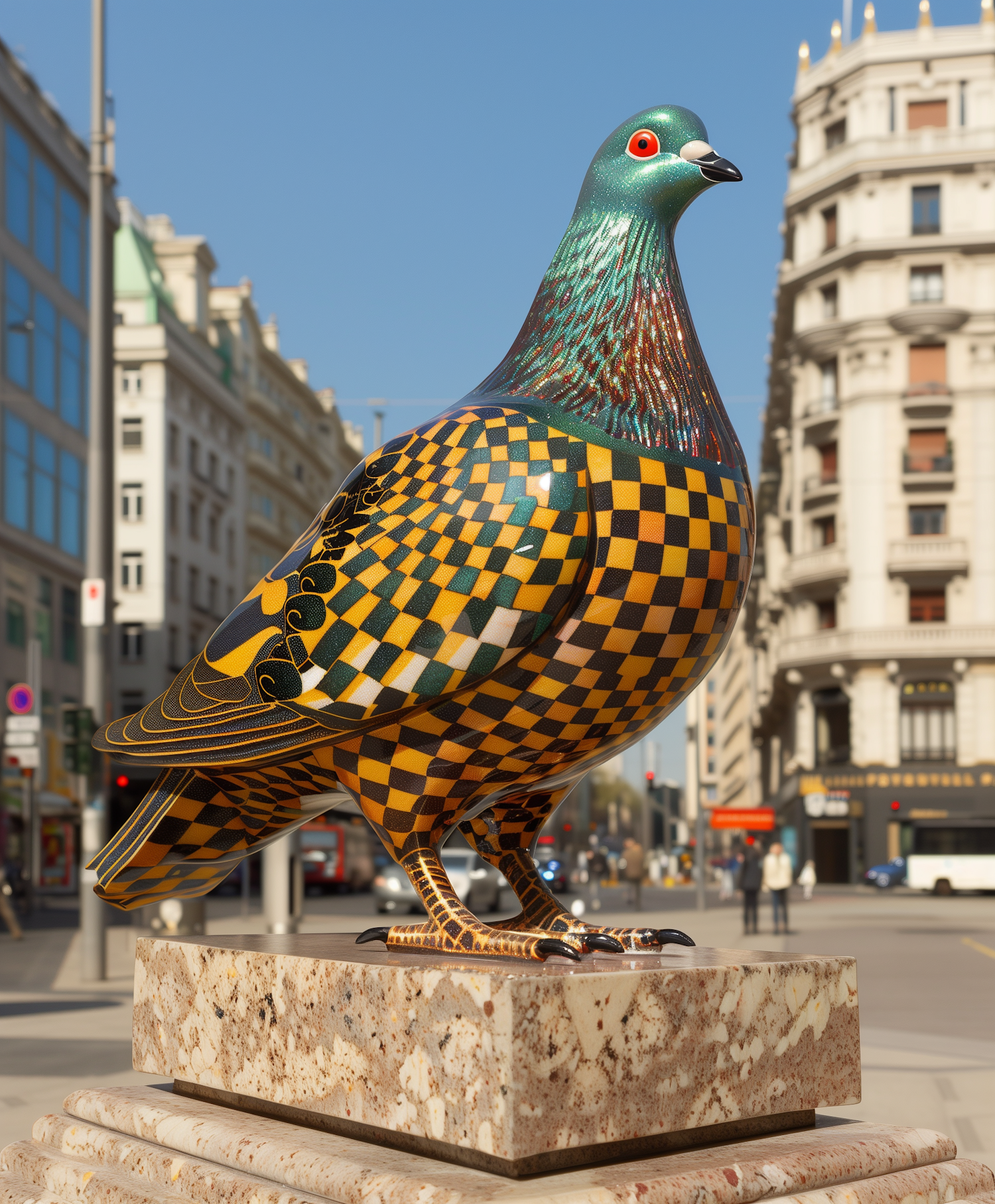 Vibrant pigeon sculpture with checkerboard pattern in urban setting, featuring intricate details and a striking red eye.