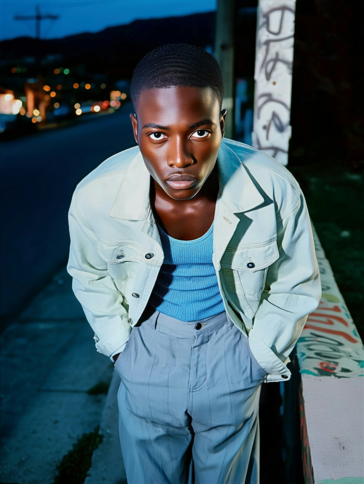 Stylish young man in a light jacket and blue shirt poses confidently against an urban backdrop at dusk.