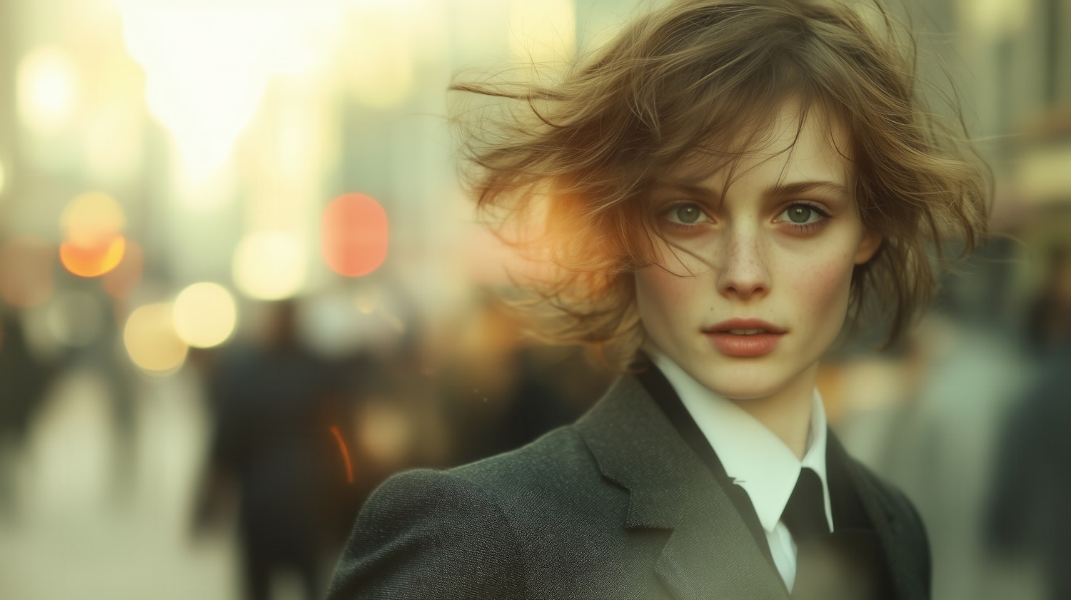 A young woman with tousled hair and green eyes in a blazer, set against a dreamy urban backdrop with glowing bokeh lights.
