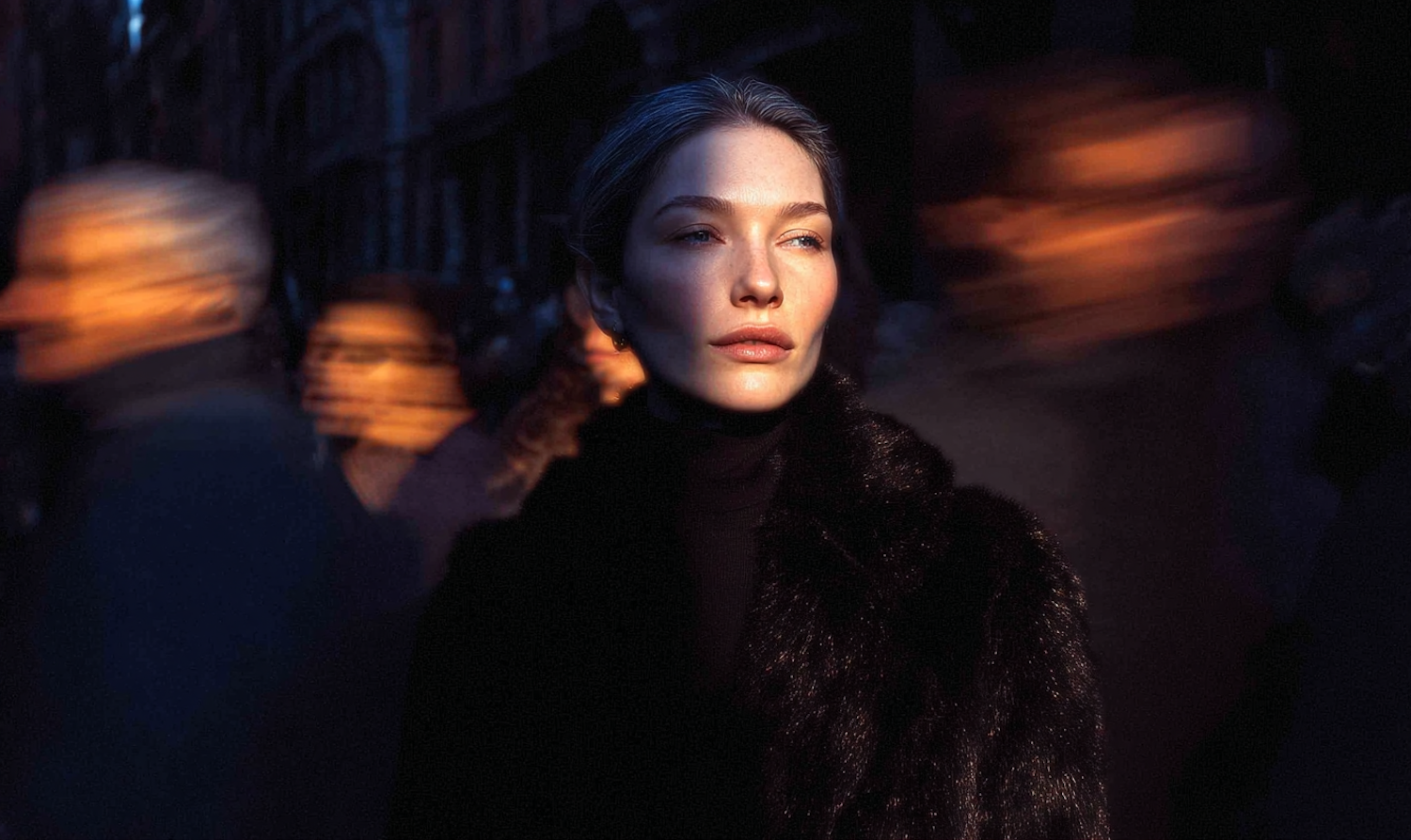 A woman in a dark fur coat stands still in a blurred crowd, her face illuminated against a dim urban backdrop.