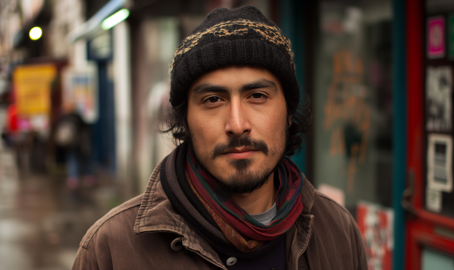 Man with a knit hat and scarf in an urban street, looking directly at the camera. Calm expression, blurred city background.
