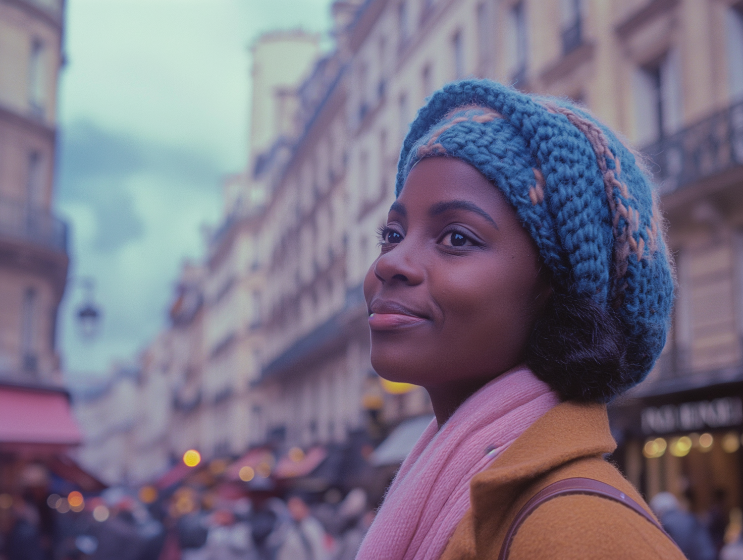A young woman in a blue knitted hat and pink scarf smiles on a bustling European street, surrounded by classic architecture.