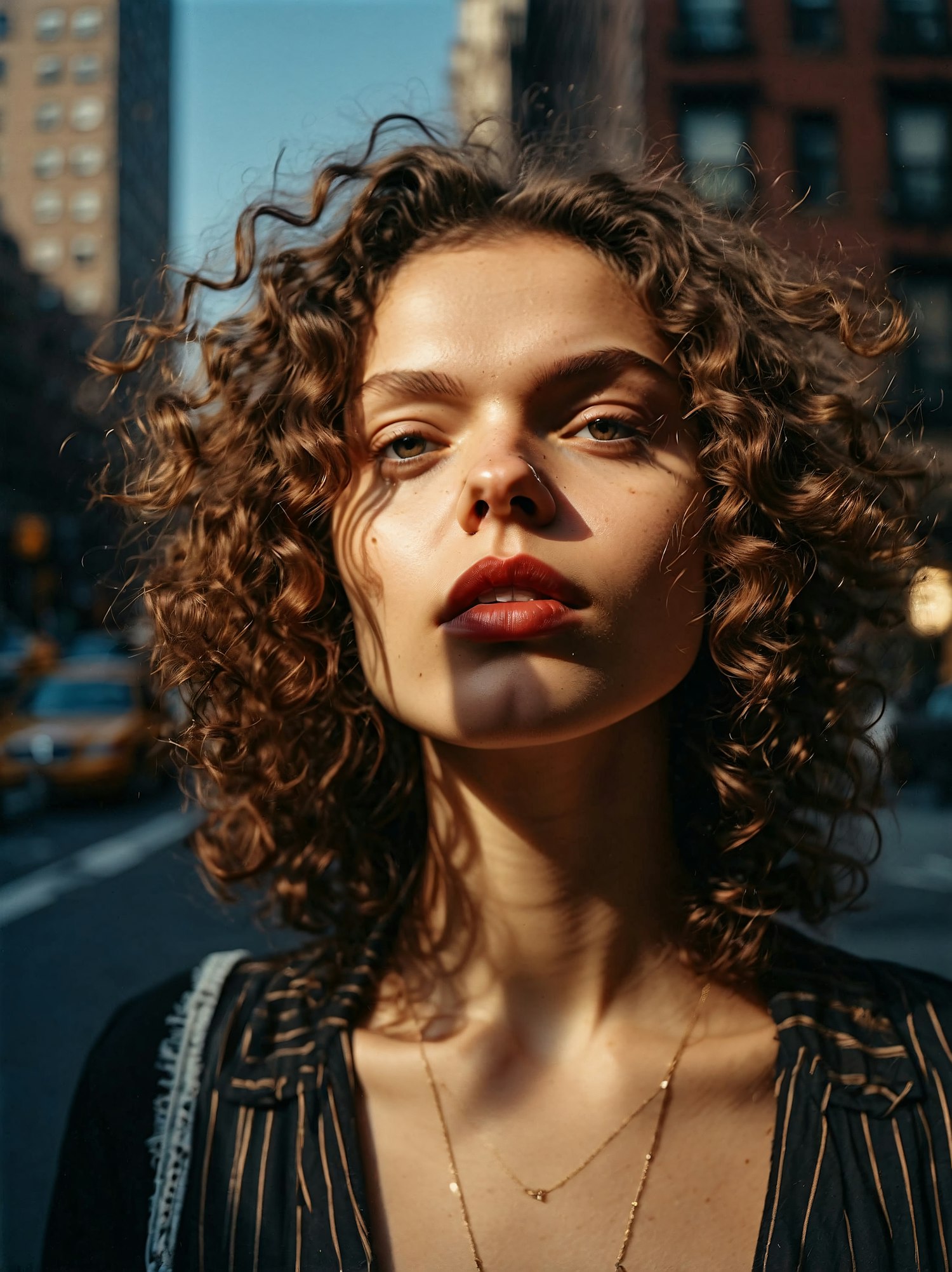 Portrait of a young woman with curly hair and red lipstick in a city setting, highlighted by dramatic sunlight and urban background.