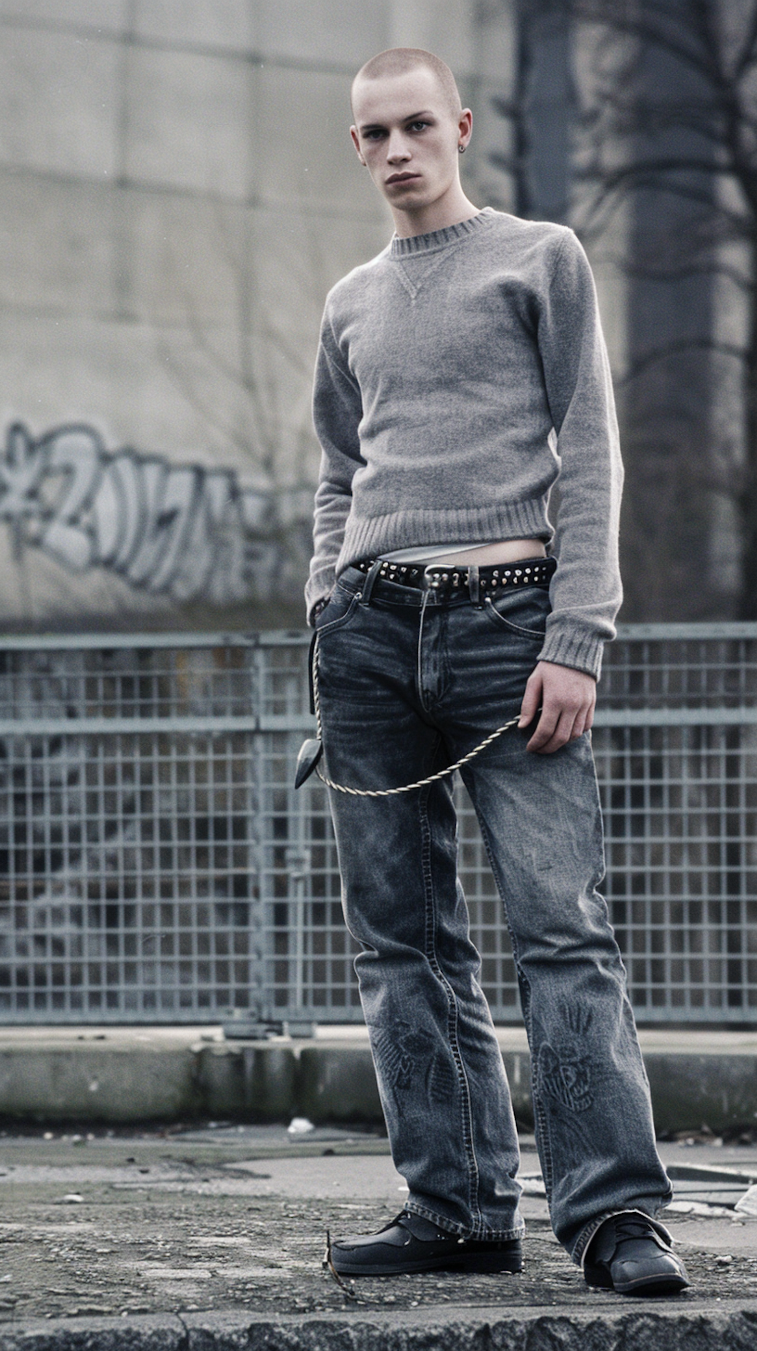Young man in urban setting with shaved head, gray sweater, and jeans. Edgy style with chain and graffiti background.