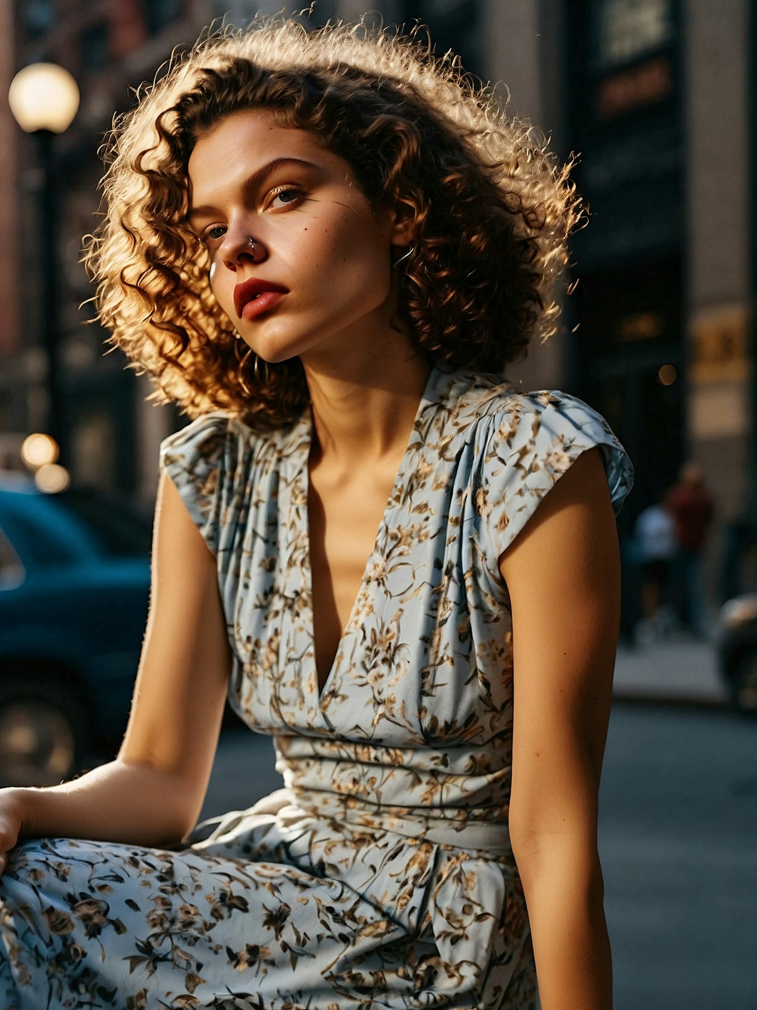 Stylish woman in a light blue floral dress with curly hair, sitting in warm urban lighting, exuding confidence and elegance.