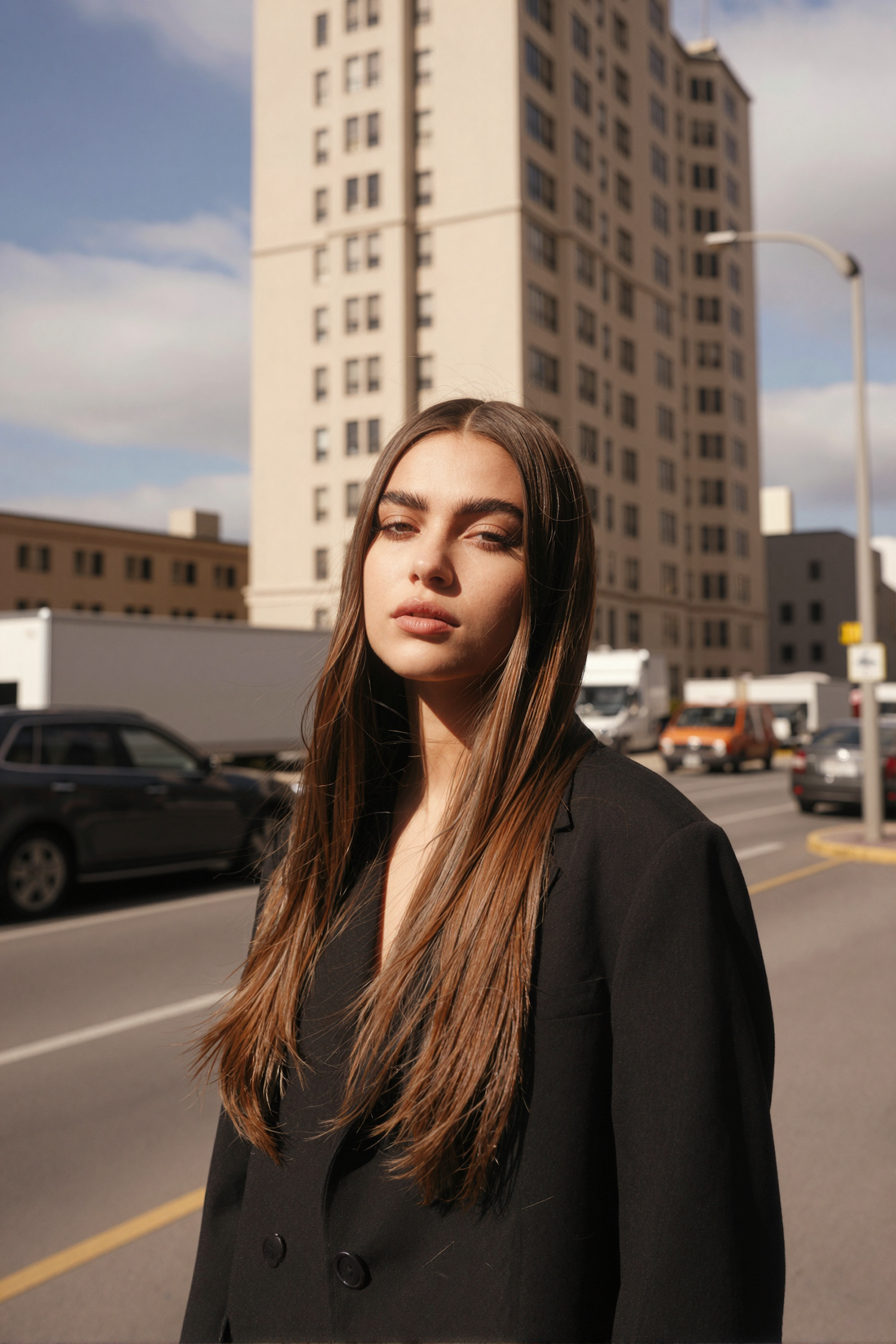 A young woman in a black blazer stands in an urban setting with a tall building and cars in the background.