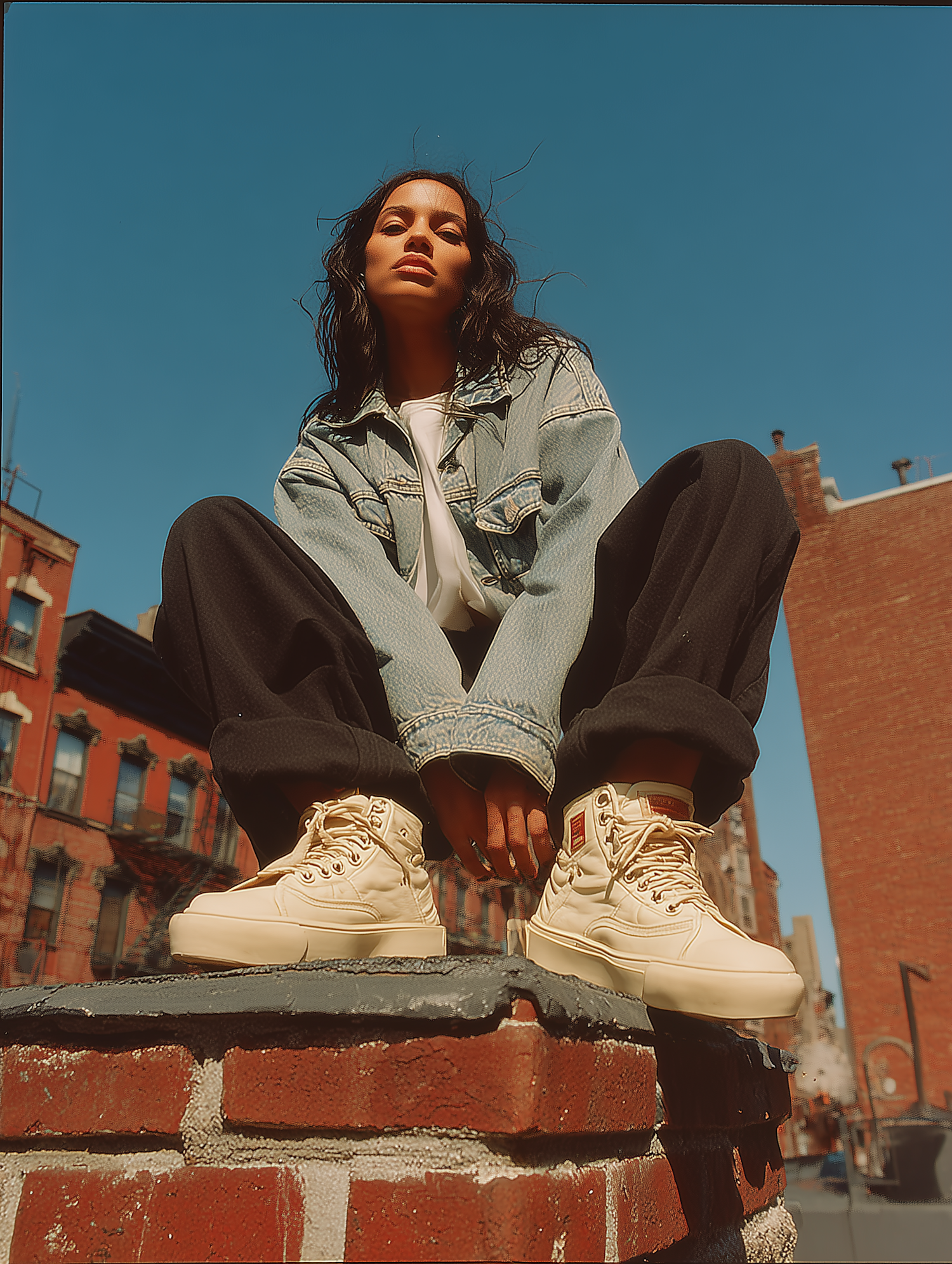 Stylish individual in a denim jacket and beige sneakers sitting on a brick structure against a clear blue sky in an urban setting.