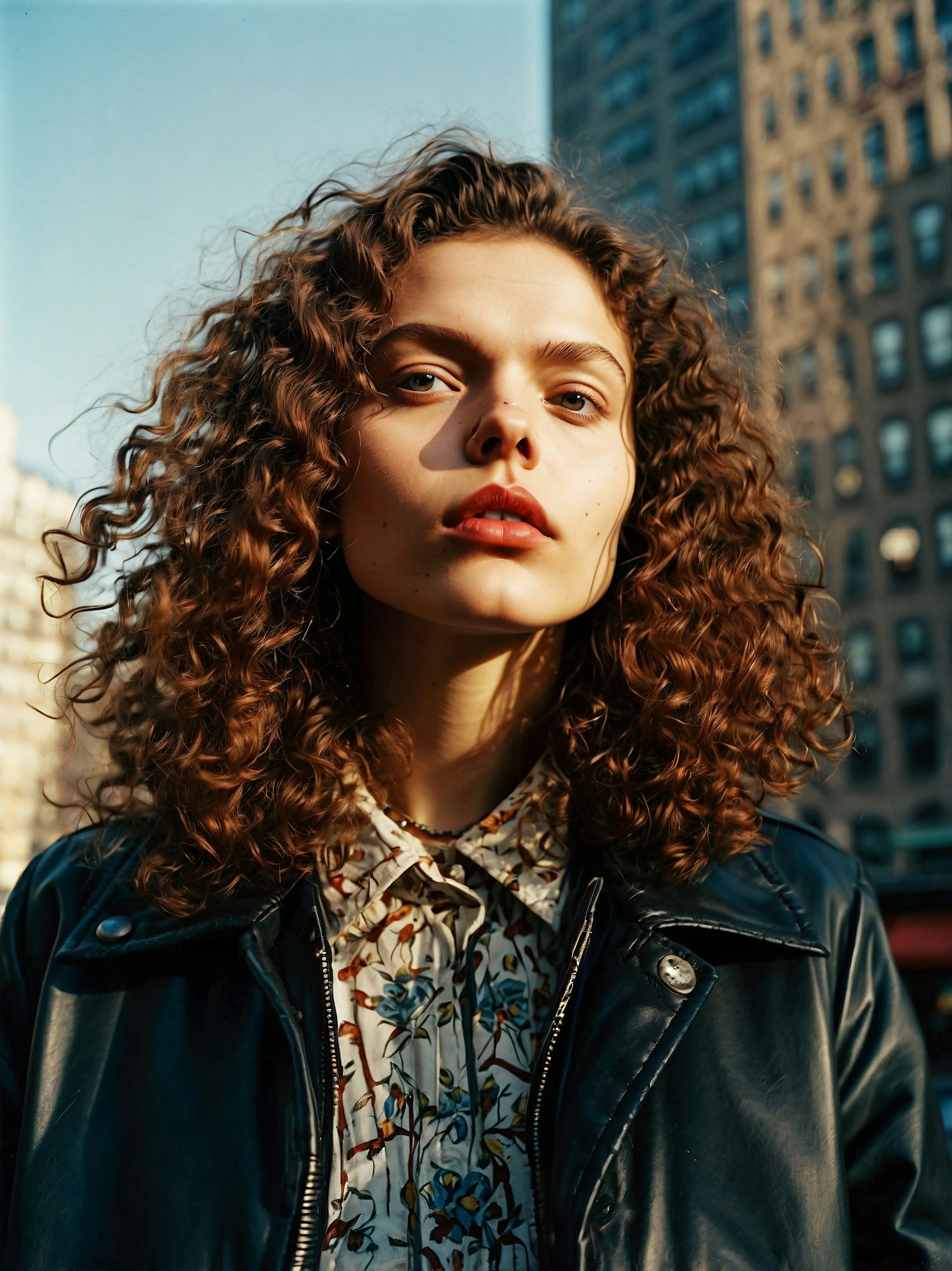 Young woman with curly hair in a leather jacket, standing in a cityscape with tall buildings and a clear blue sky.