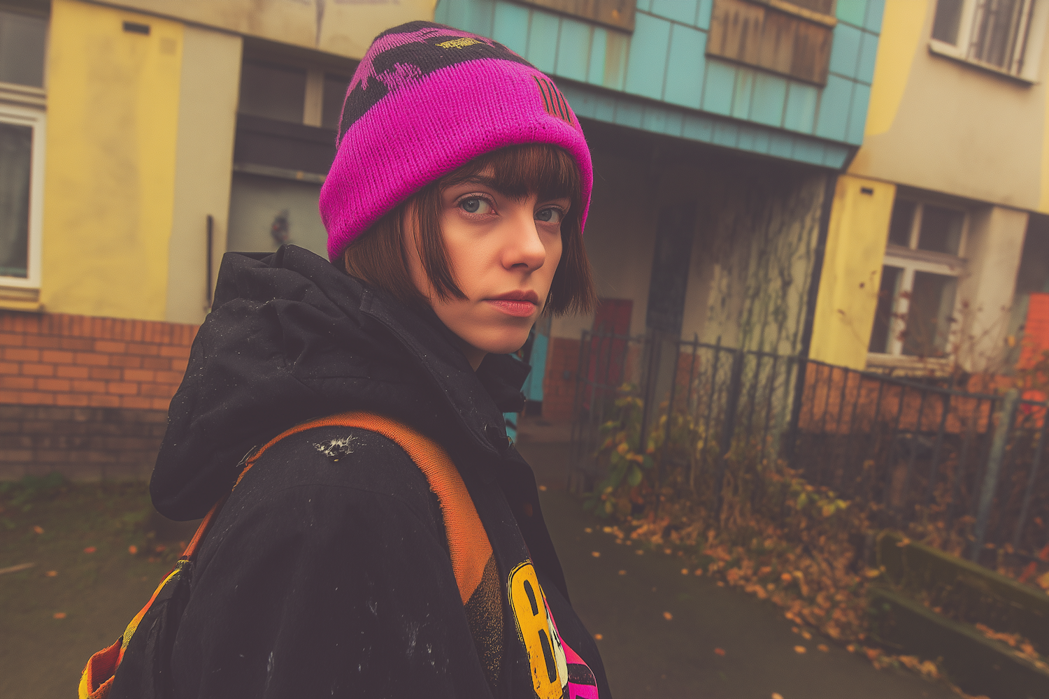 Young woman in a pink beanie and black jacket outdoors, with an urban backdrop of pastel buildings and overgrown plants.