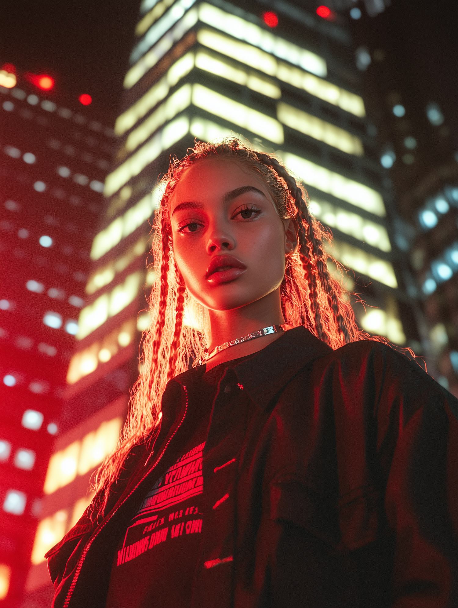 Young woman with braided hair in a city at night, illuminated by red and yellow lights, creating a dramatic urban atmosphere.